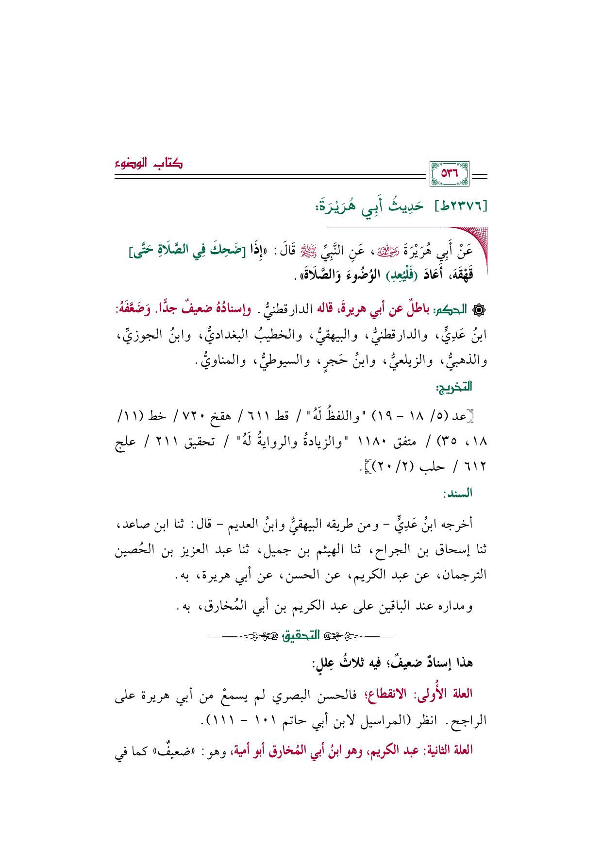 العلة الأُولى: الانقطاع؛ فالحسن البصري لم يسمعْ من أبي هريرة على الراجح. انظر (المراسيل لابن أبي حاتم ١٠١ - ١١١).