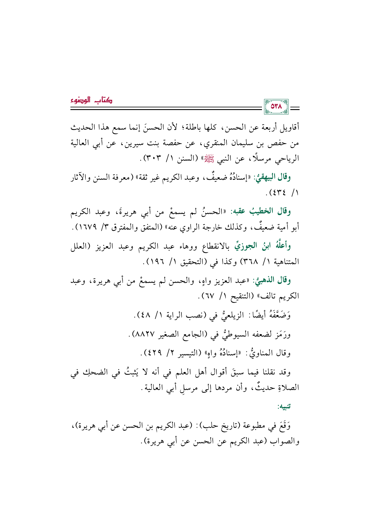 أقاويل أربعة عن الحسن، كلها باطلة؛ لأن الحسنَ إنما سمع هذا الحديث من حفص بن سليمان المنقري، عن حفصة بنت سيرين، عن أبي العالية الرياحي مرسلًا، عن النبي صلى الله عليه وسلم" (السنن ١/ ٣٠٣).