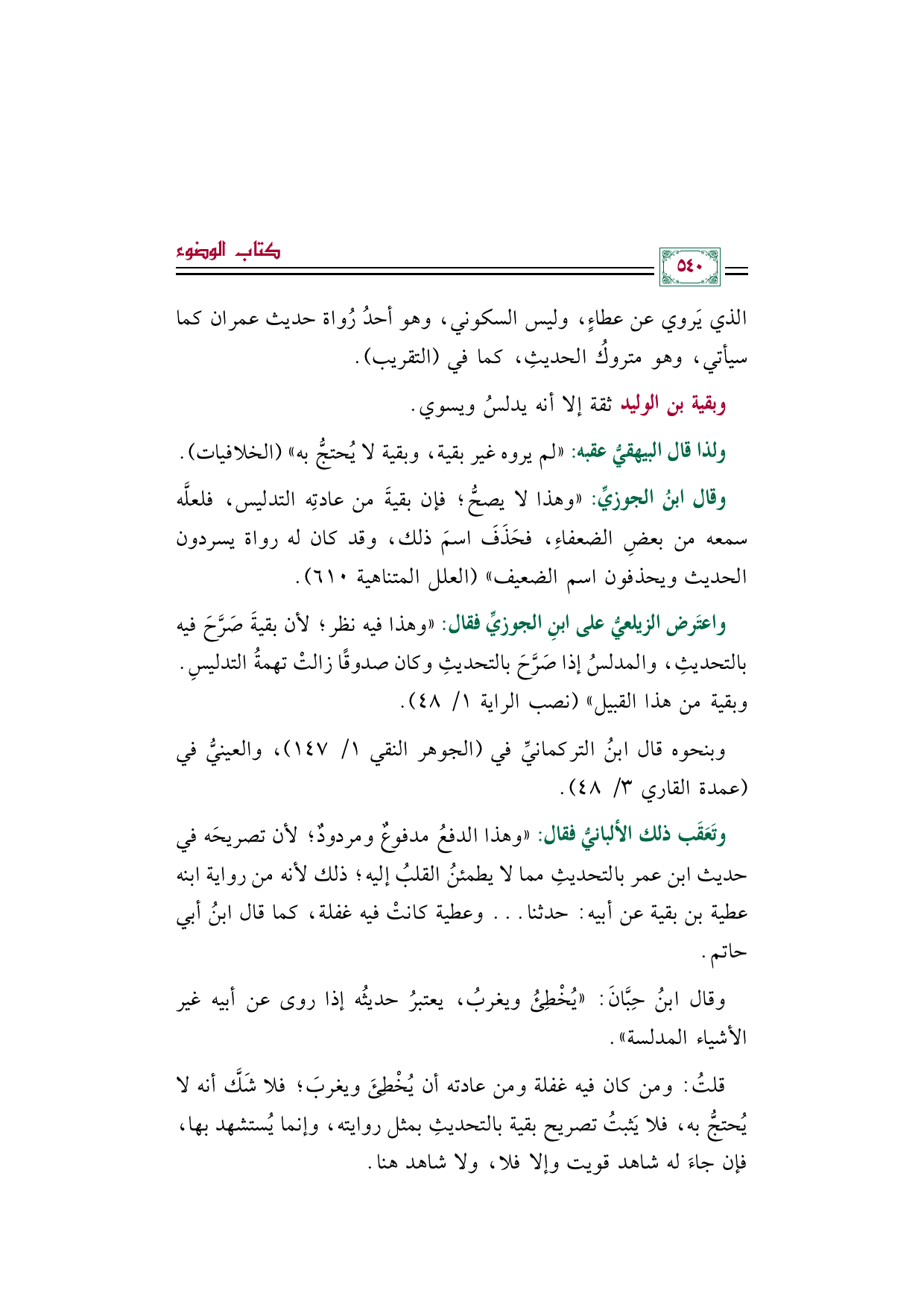 واعتَرض الزيلعيُّ على ابنِ الجوزيِّ فقال: "وهذا فيه نظر؛ لأن بقيةَ صَرَّحَ فيه بالتحديثِ، والمدلسُ إذا صَرَّحَ بالتحديثِ وكان صدوقًا زالتْ تهمةُ التدليسِ. وبقية من هذا القبيل" (نصب الراية ١/ ٤٨).