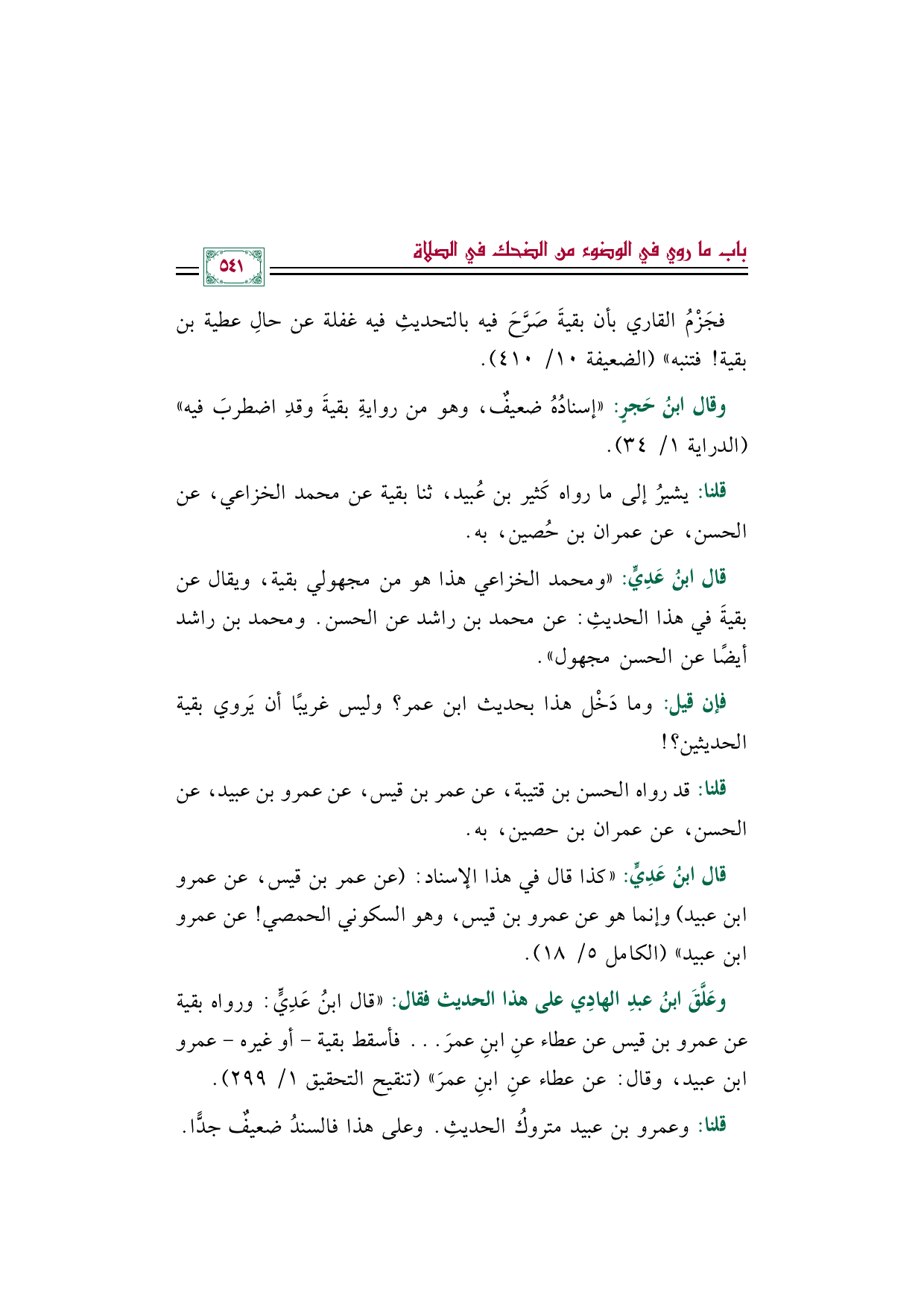 وعَلَّقَ ابنُ عبدِ الهادِي على هذا الحديث فقال: "قال ابنُ عَدِيٍّ: ورواه بقية عن عمرو بن قيس عن عطاء عنِ ابنِ عمرَ ... فأسقط بقية -أو غيره- عمرو بن عبيد، وقال: عن عطاء عنِ ابنِ عمرَ" (تنقيح التحقيق ١/ ٢٩٩).