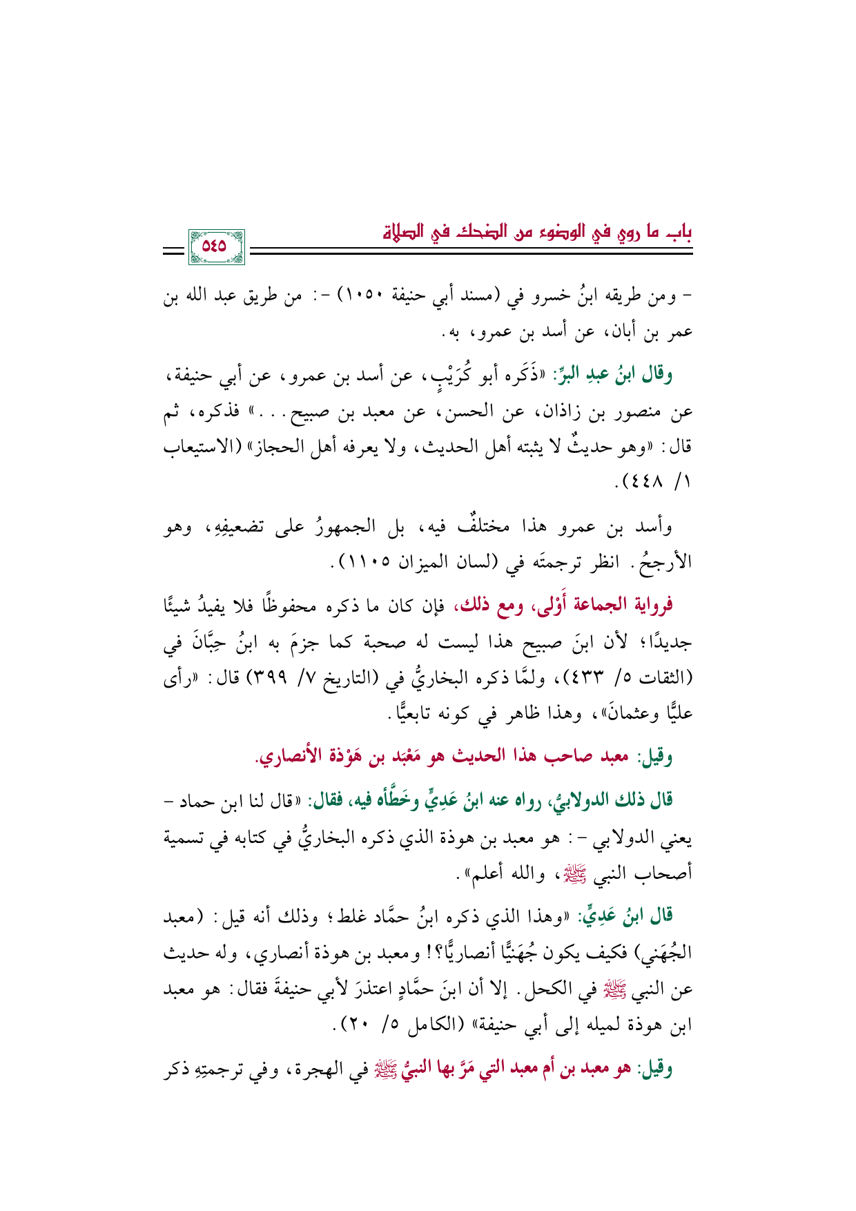 -ومن طريقه ابنُ خسرو في (مسند أبي حنيفة ١٠٥٠) -: من طريق عبد الله بن عمر بن أبان، عن أسد بن عمرو، به.