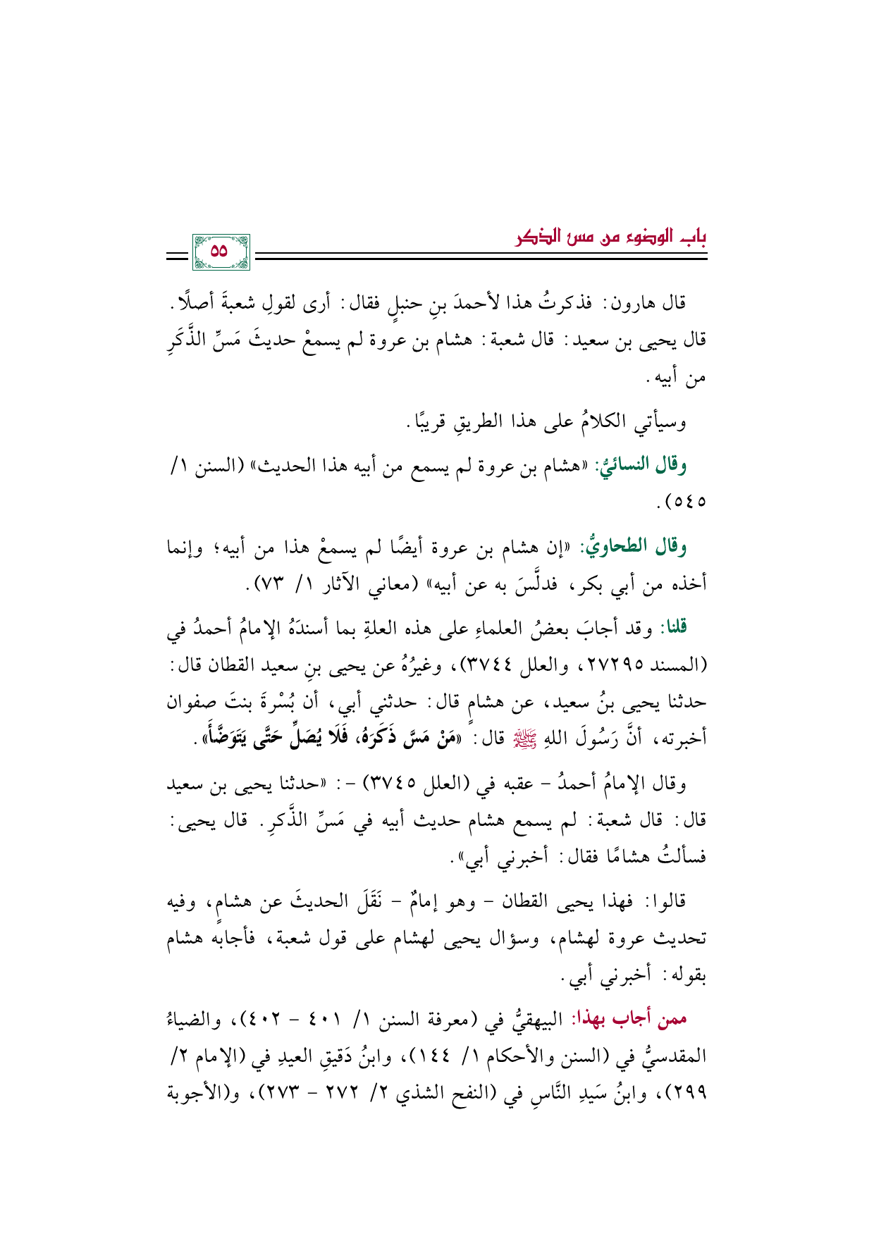قلنا: وقد أجابَ بعضُ العلماءِ على هذه العلةِ بما أسندَهُ الإمامُ أحمدُ في (المسند ٢٧٢٩٥، والعلل ٣٧٤٤)، وغيرُهُ عن يحيى بنِ سعيد القطان قال: حدثنا يحيى بنُ سعيد، عن هشامٍ قال: حدثني أبي، أن بُسْرةَ بنتَ صفوان أخبرته، أنَّ رَسُولَ اللهِ صلى الله عليه وسلم قال: ((مَنْ مَسَّ ذَكَرَهُ، فَلَا يُصَلِّ حَتَّى يَتَوَضَّأَ)).