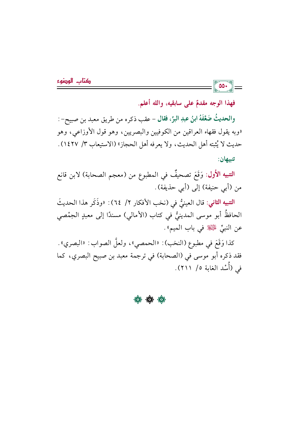 التنبيه الثاني: قال العينيُّ في (نخب الأفكار ٢/ ٦٤): "وذَكَر هذا الحديثَ الحافظُ أبو موسى المدينيُّ في كتاب (الأمالي) مسندًا إلى معبدٍ الحِمْصي عن النبيِّ عليه السلام في باب الميم".