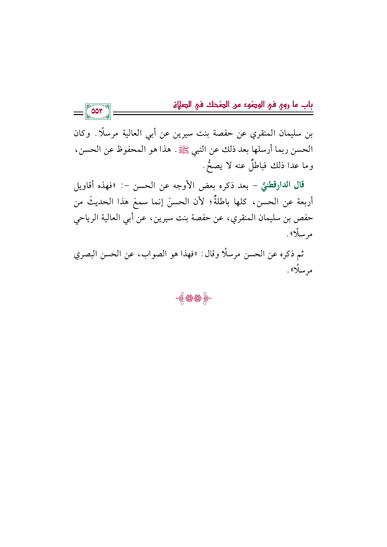 قال الدارقطنيُّ -بعد ذكره بعض الأوجه عن الحسن-: "فهذه أقاويل أربعة عن الحسن، كلها باطلةٌ؛ لأن الحسنَ إنما سمعَ هذا الحديثَ من حفص بن سليمان المنقري، عن حفصة بنت سيرين، عن أبي العالية الرياحي مرسلًا".