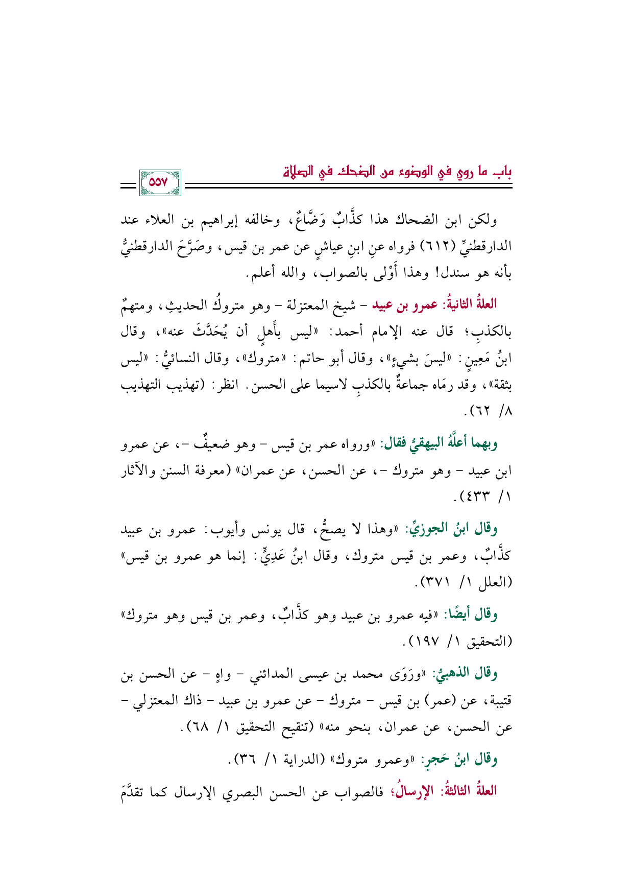 العلةُ الثانيةُ: عمرو بن عبيد -شيخ المعتزلة- وهو متروكُ الحديثِ، ومتهمٌ بالكذبِ؛ قال عنه الإمام أحمد: ((ليس بأَهلٍ أن يُحَدَّثَ عنه))، وقال ابنُ مَعِينٍ: ((ليسَ بشيءٍ))، وقال أبو حاتم: ((متروك))، وقال النسائيُّ: ((ليس بثقة))، وقد رمَاه جماعةٌ بالكذبِ لاسيما على الحسن. انظر: (تهذيب التهذيب ٨/ ٦٢).