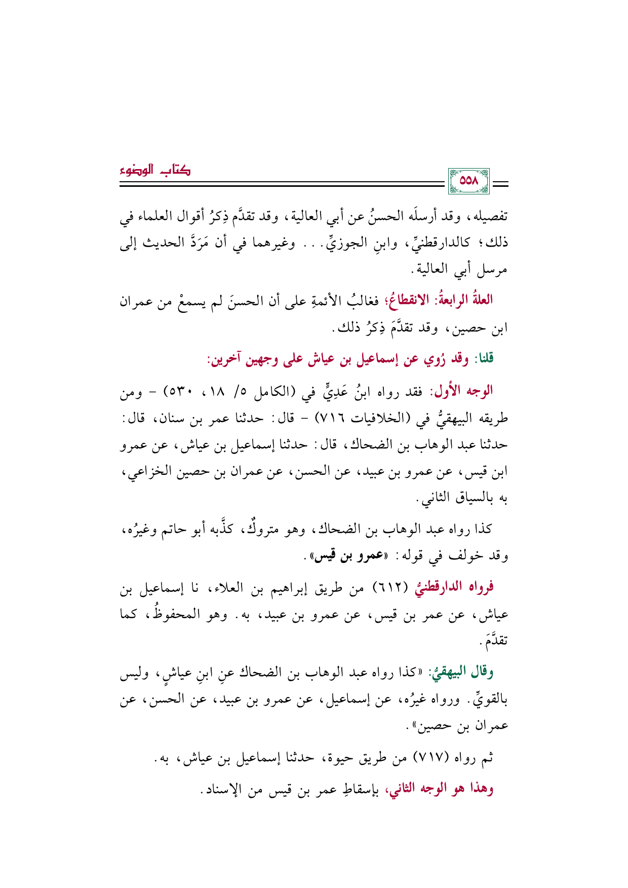 وقال البيهقيُّ: "كذا رواه عبد الوهاب بن الضحاك عنِ ابنِ عياشٍ، وليس بالقويِّ. ورواه غيرُه، عن إسماعيل، عن عمرو بن عبيد، عن الحسن، عن عمران بن حصين".