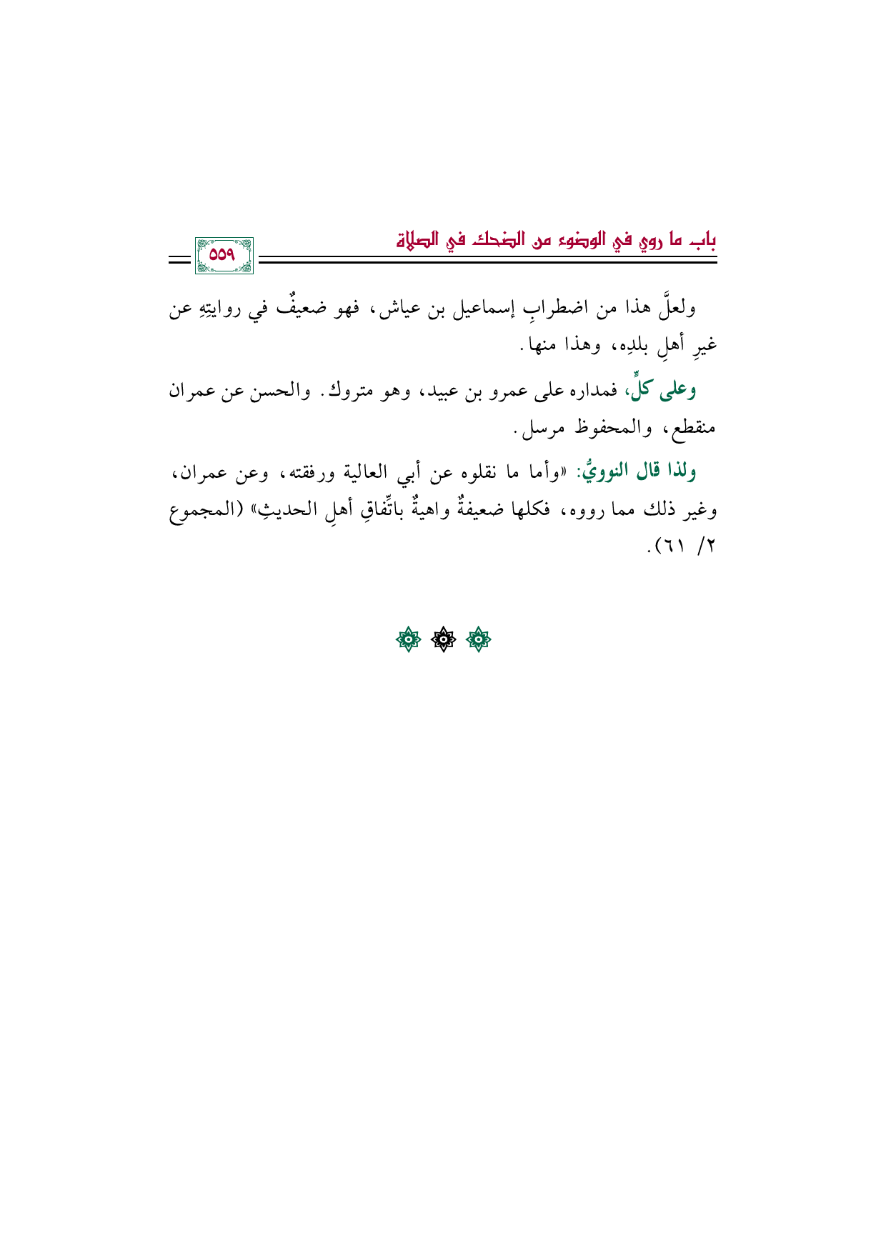 ولذا قال النوويُّ: "وأما ما نقلوه عن أبي العالية ورفقته، وعن عمران، وغير ذلك مما رووه، فكلها ضعيفةٌ واهيةٌ باتِّفاقِ أهلِ الحديثِ" (المجموع ٢/ ٦١).
