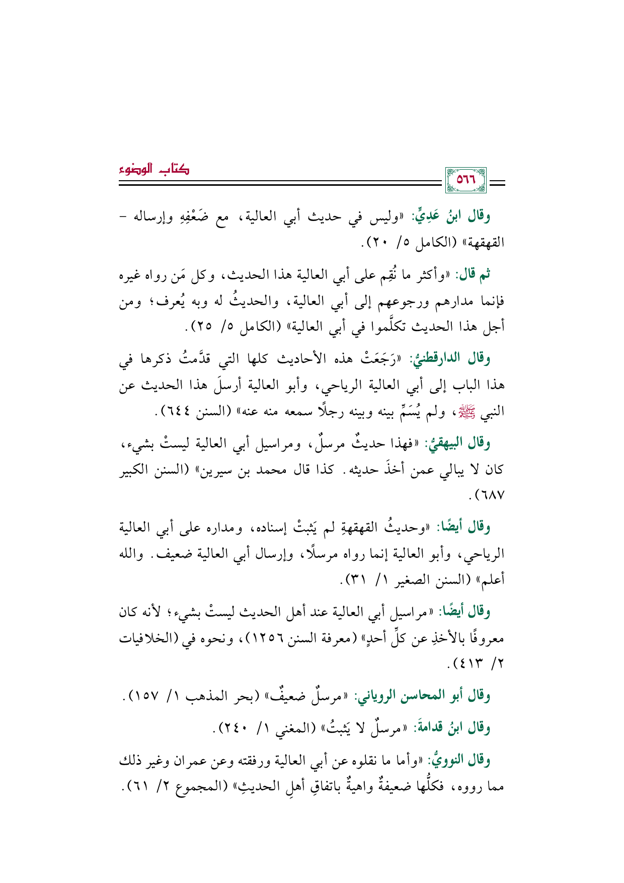 وقال أيضًا: "وحديثُ القهقهةِ لم يَثبتْ إسناده، ومداره على أبي العالية الرياحي، وأبو العالية إنما رواه مرسلًا، وإرسال أبي العالية ضعيف. والله أعلم" (السنن الصغير ١/ ٣١).