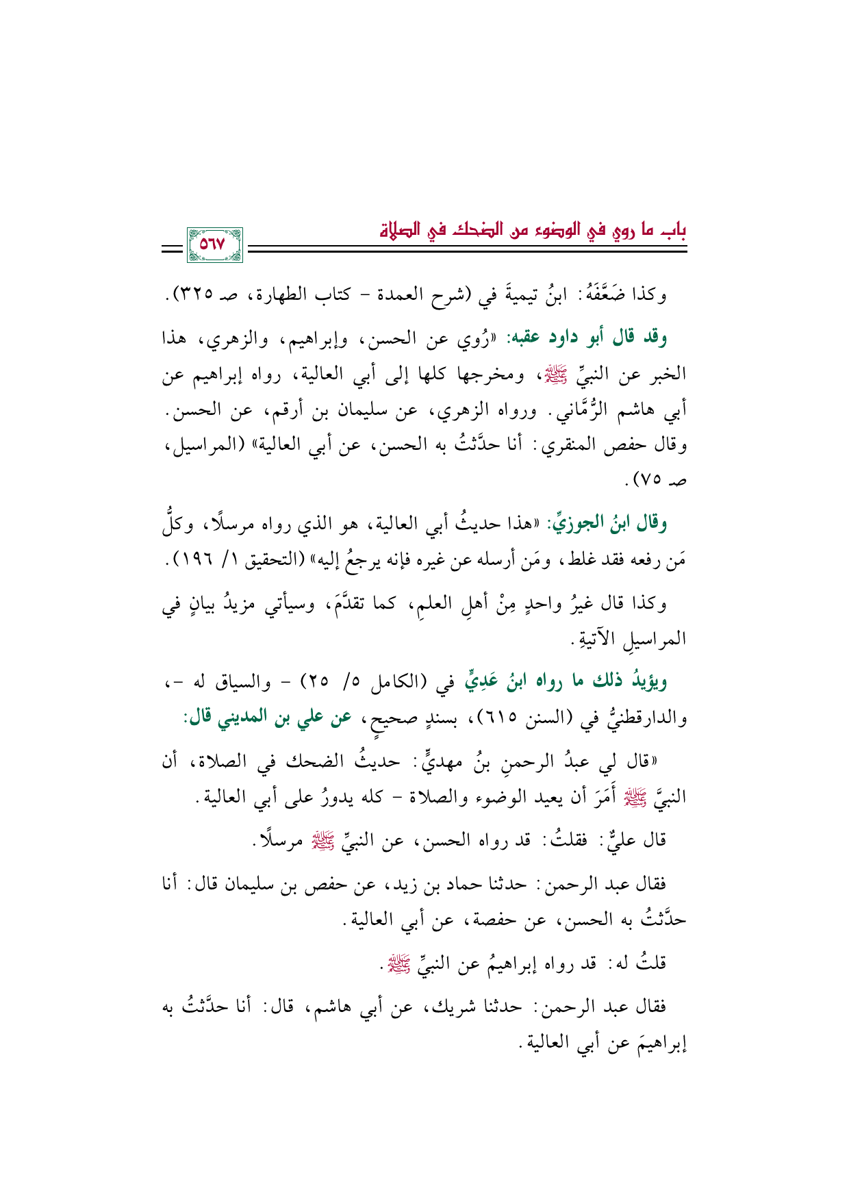 ((قال لي عبدُ الرحمنِ بنُ مهديٍّ: حديثُ الضحك في الصلاة، أن النبيَّ صلى الله عليه وسلم أَمَرَ أن يعيد الوضوء والصلاة- كله يدورُ على أبي العالية.