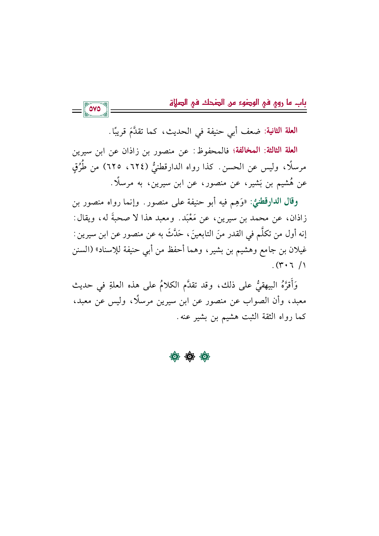 العلة الثالثة: المخالفة؛ فالمحفوظ: عن منصور بن زاذان عن ابن سيرين مرسلًا، وليس عن الحسن. كذا رواه الدارقطنيُّ (٦٢٤، ٦٢٥) من طُرُقٍ عن هُشيم بن بَشير، عن منصور، عن ابن سيرين، به مرسلًا.
