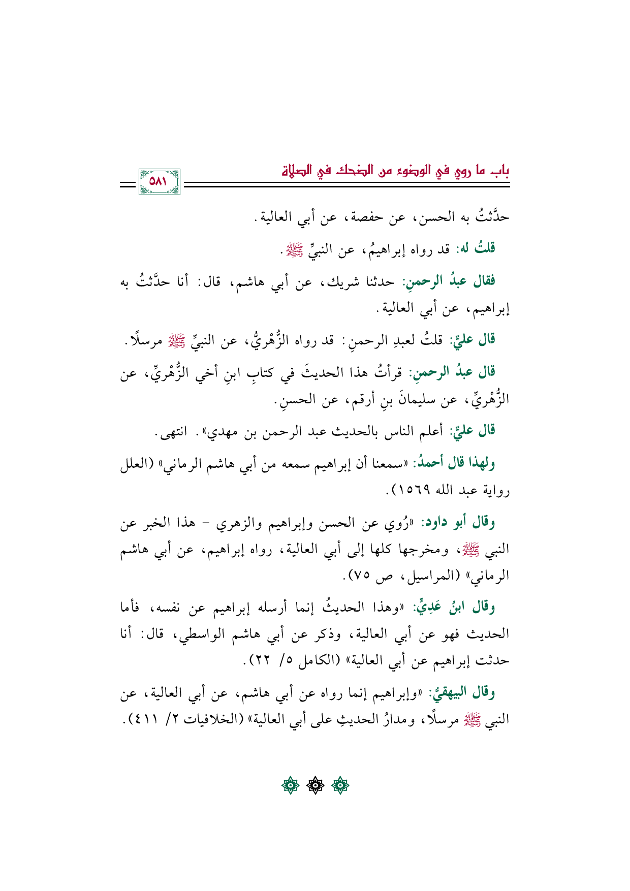 وقال أبو داود: "رُوي عن الحسن وإبراهيم والزهري- هذا الخبر عن النبي صلى الله عليه وسلم، ومخرجها كلها إلى أبي العالية، رواه إبراهيم، عن أبي هاشم الرماني" (المراسيل، ص ٧٥).