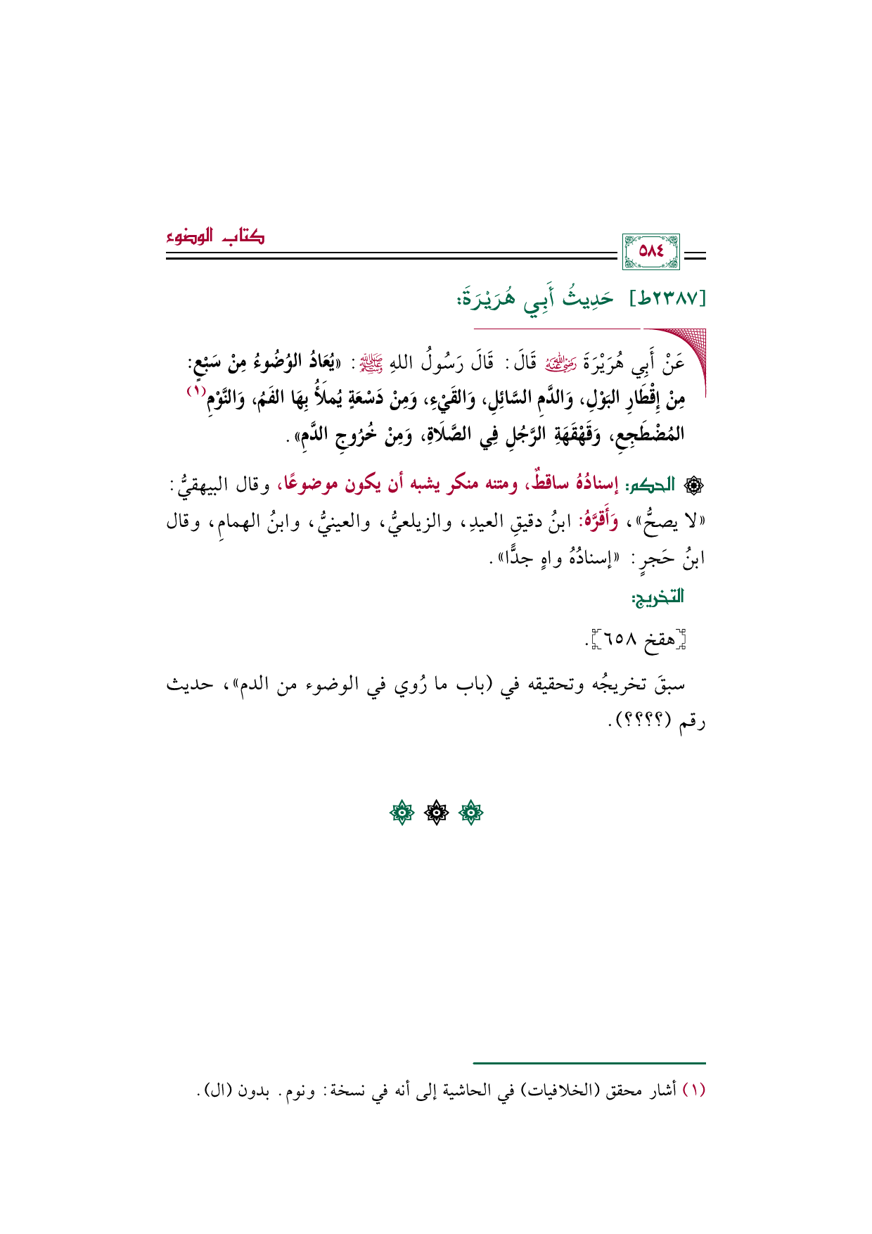 سبقَ تخريجُه وتحقيقه في (باب ما رُوي في الوضوء من الدم"، حديث رقم (؟ ؟ ؟ ؟ ).