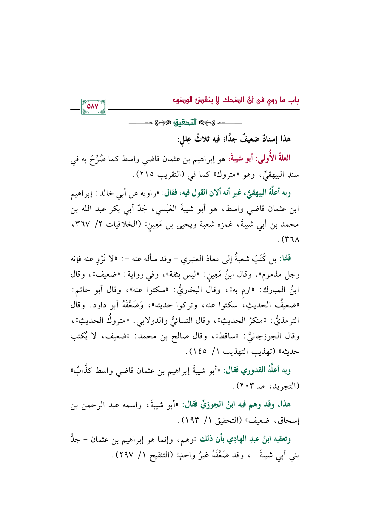 وبه أعلَّهُ البيهقيُّ، غير أنه ألان القول فيه، فقال: "راويه عن أبي خالد: إبراهيم بن عثمان قاضي واسط، هو أبو شيبةَ العَبْسي، جَدّ أبي بكر عبد الله بن محمد بن أبي شيبةَ، غمزه شعبة ويحيى بن مَعِينٍ" (الخلافيات ٢/ ٣٦٧، ٣٦٨).
