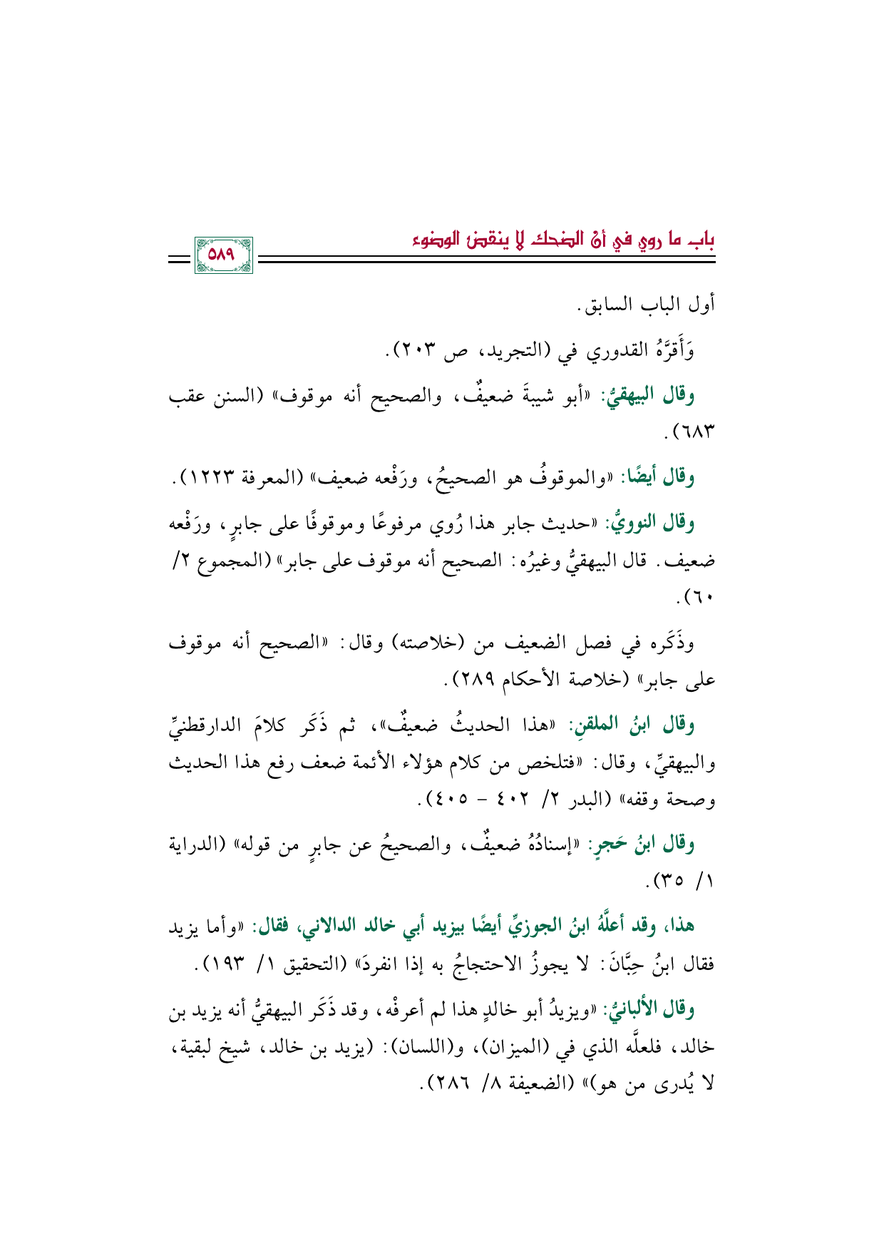 وذَكَره في فصل الضعيف من (خلاصته) وقال: "الصحيح أنه موقوف على جابر" (خلاصة الأحكام ٢٨٩).