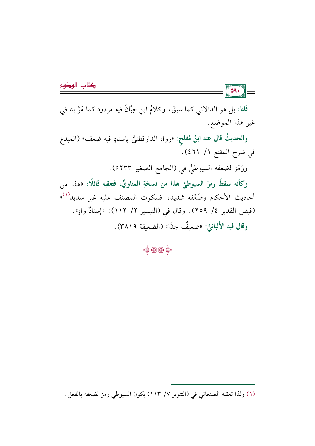 (¬١) ولذا تعقبه الصنعاني في (التنوير ٧/ ١١٣) بكون السيوطي رمز لضعفه بالفعل.