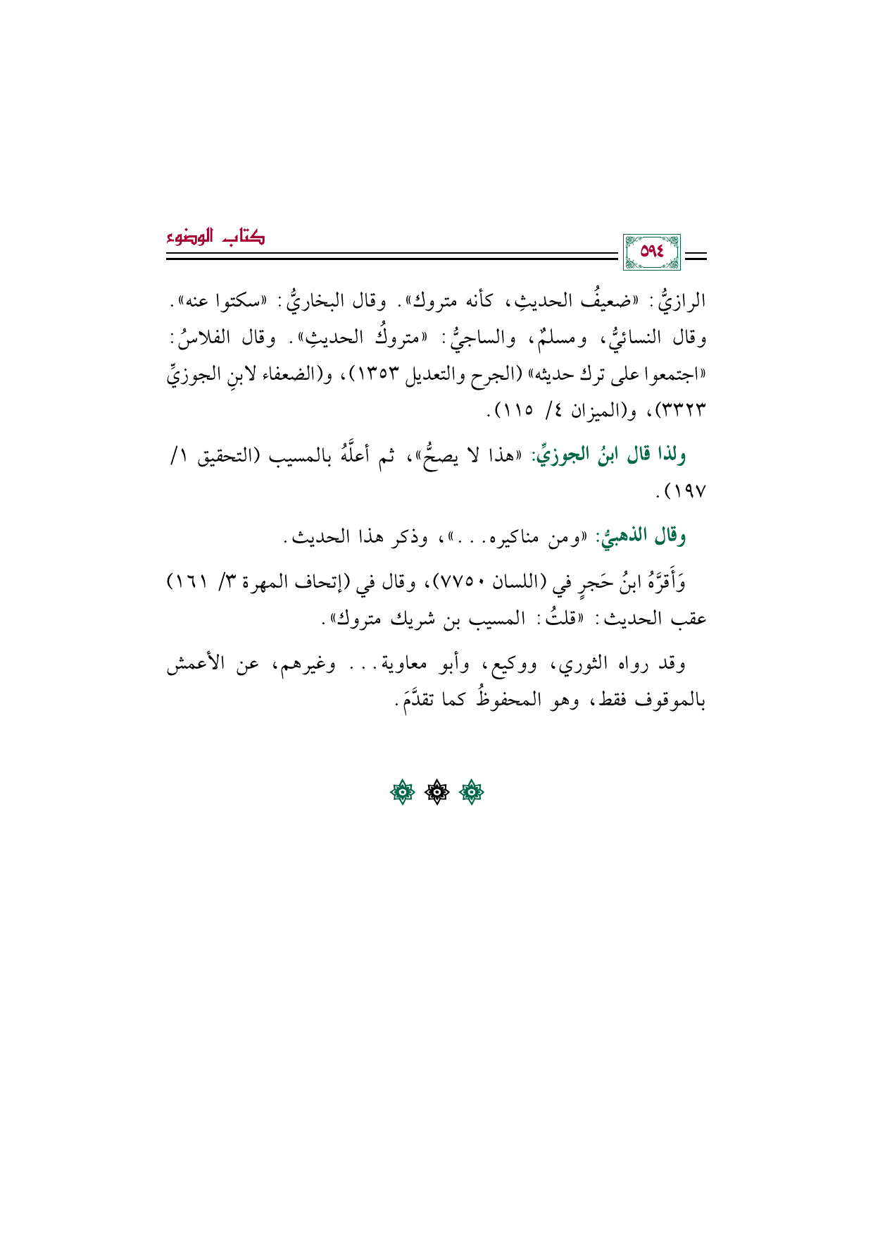 وَأَقرَّهُ ابنُ حَجرٍ في (اللسان ٧٧٥٠)، وقال في (إتحاف المهرة ٣/ ١٦١) عقب الحديث: "قلتُ: المسيب بن شريك متروك".