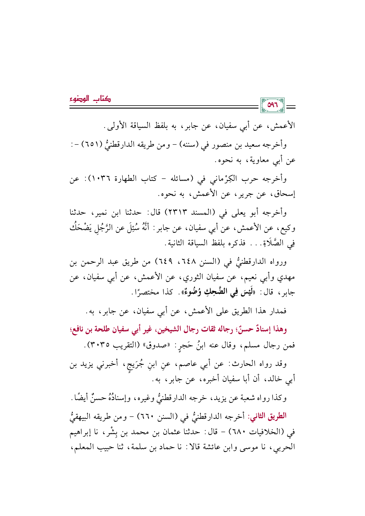 ورواه الدارقطنيُّ في (السنن ٦٤٨، ٦٤٩) من طريق عبد الرحمن بن مهدي وأبي نعيم، عن سفيان الثوري، عن الأعمش، عن أبي سفيان، عن جابر، قال: ((لَيْسَ فِي الضَّحِكِ وُضُوءٌ)). كذا مختصرًا.