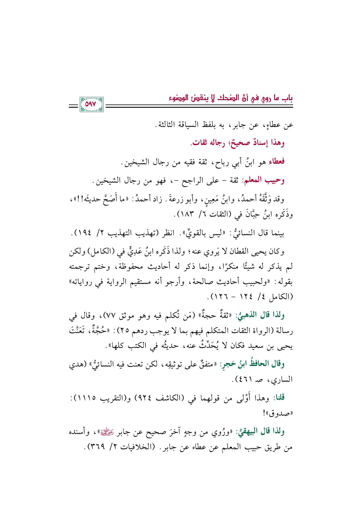 ولذا قال البيهقيُّ: ((ورُوي من وجهٍ آخرَ صحيح عن جابر رضي الله عنه))، وأسنده من طريق حبيب المعلم عن عطاء عن جابر. (الخلافيات ٢/ ٣٦٩).