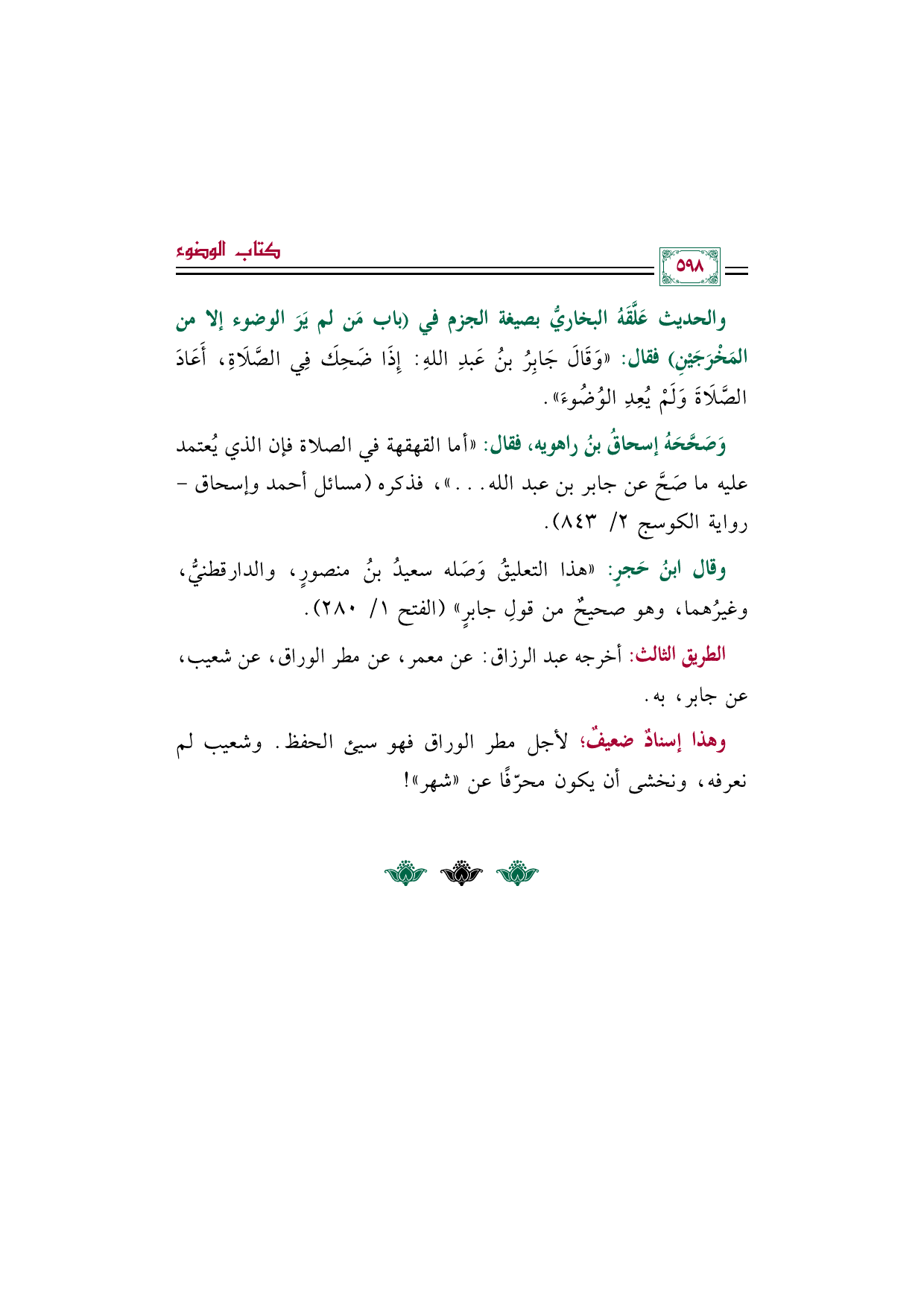وقال ابنُ حَجرٍ: "هذا التعليقُ وَصَله سعيدُ بنُ منصورٍ، والدارقطنيُّ، وغيرُهما، وهو صحيحٌ من قولِ جابرٍ" (الفتح ١/ ٢٨٠).