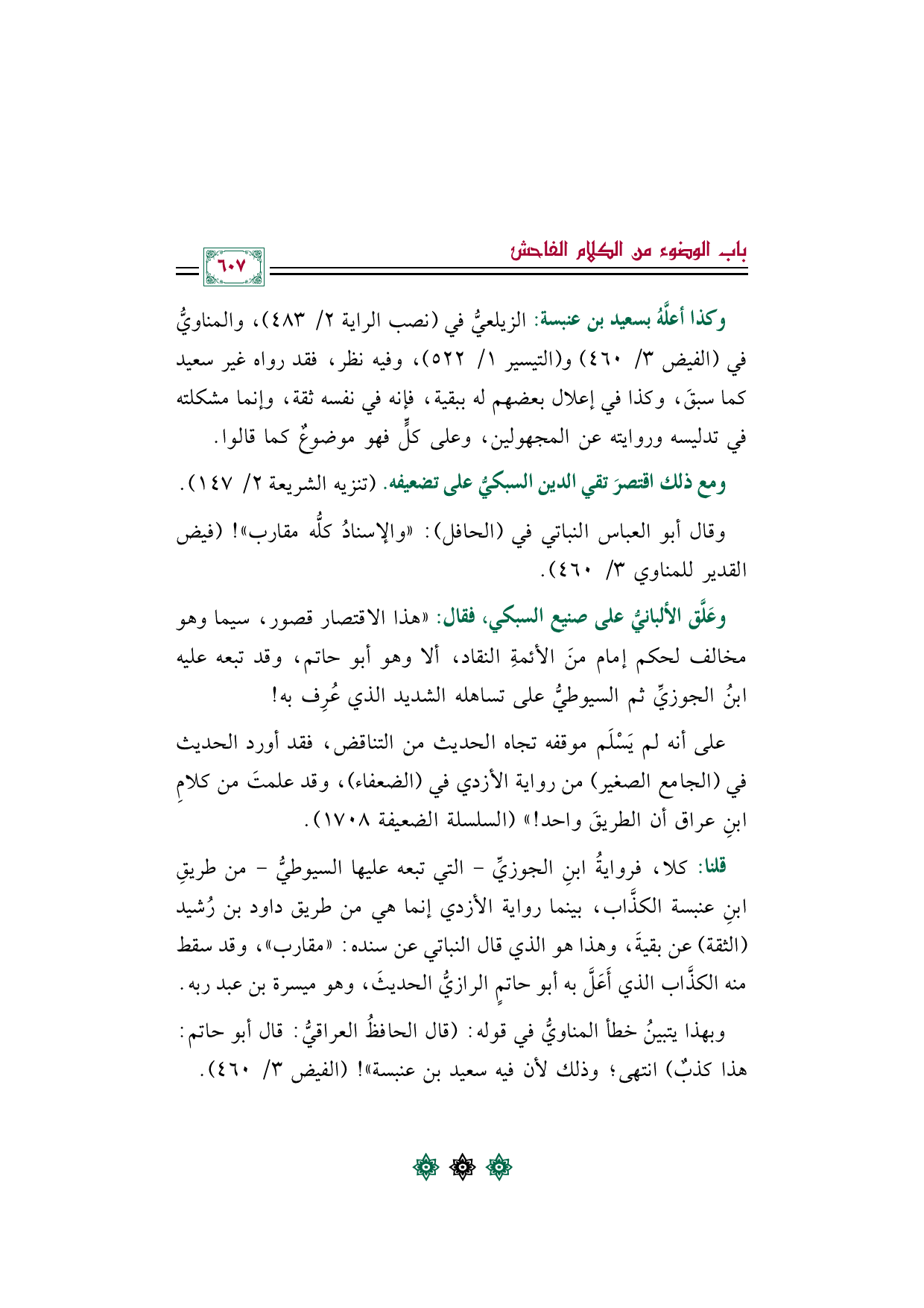 وبهذا يتبينُ خطأ المناويُّ في قوله: (قال الحافظُ العراقيُّ: قال أبو حاتم: هذا كذبٌ) انتهى؛ وذلك لأن فيه سعيد بن عنبسة"! (الفيض ٣/ ٤٦٠).