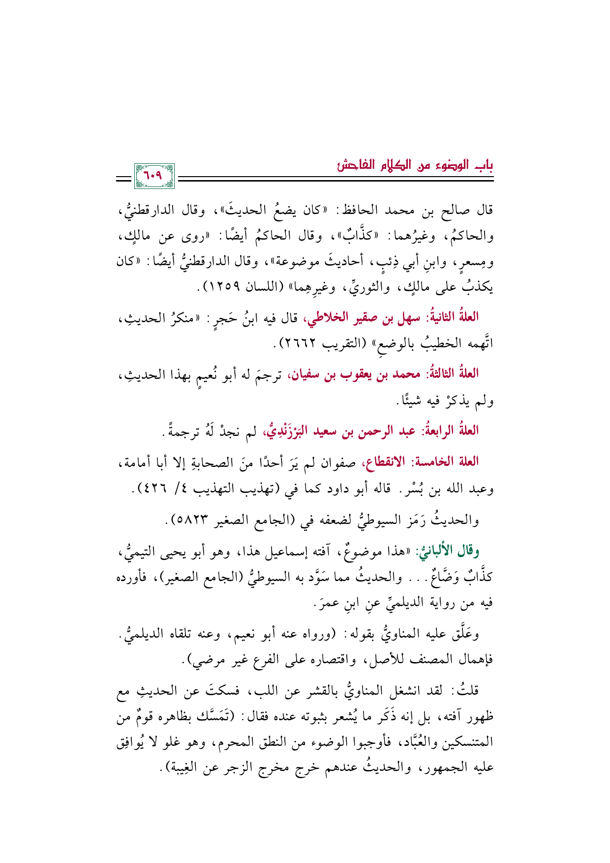 قلتُ: لقد انشغل المناويُّ بالقشر عن اللب، فسكتَ عن الحديثِ مع ظهور آفته، بل إنه ذَكَر ما يُشعر بثبوته عنده فقال: (تَمَسَّك بظاهره قومٌ من المتنسكين والعُبَّاد، فأوجبوا الوضوء من النطق المحرم، وهو غلو لا يُوافِق عليه الجمهور، والحديثُ عندهم خرج مخرج الزجر عن الغِيبة).