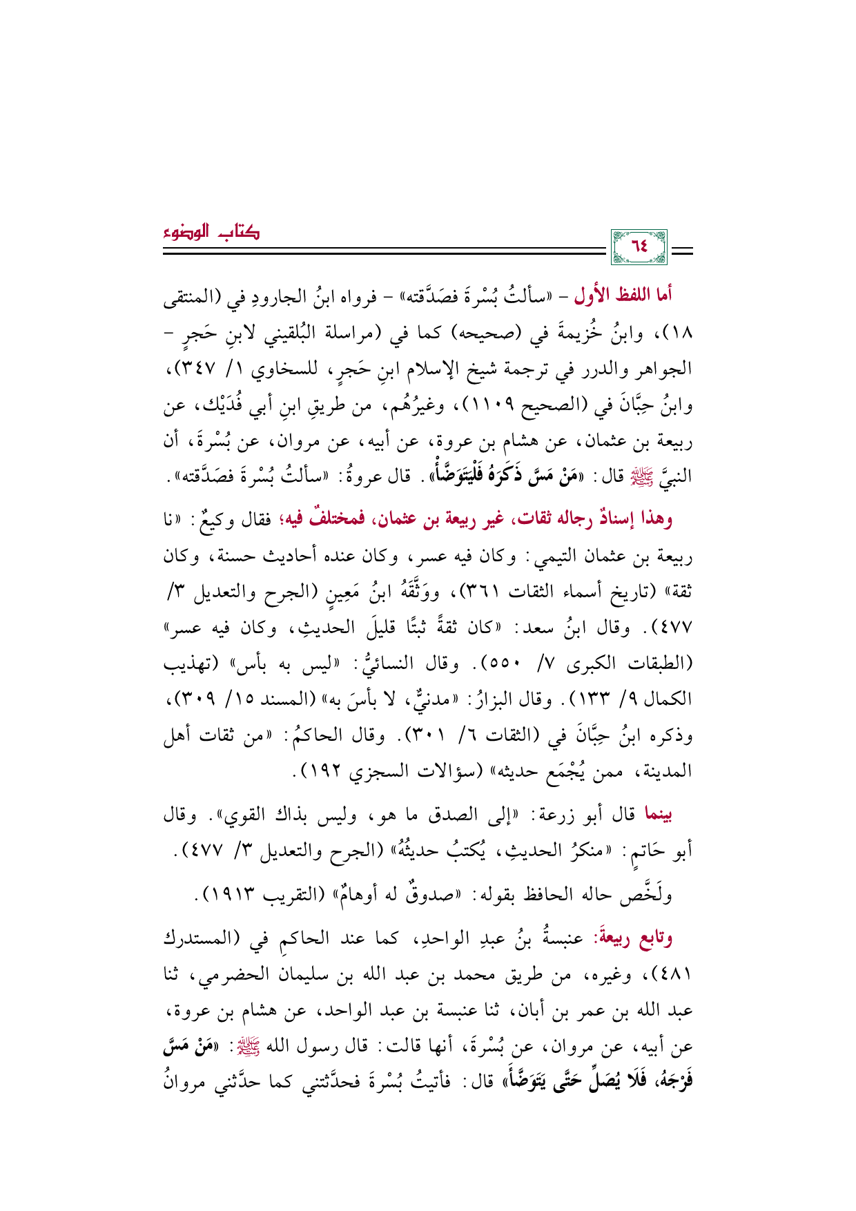 وتابع ربيعةَ: عنبسةُ بنُ عبدِ الواحدِ، كما عند الحاكمِ في (المستدرك ٤٨١)، وغيره، من طريق محمد بن عبد الله بن سليمان الحضرمي، ثنا عبد الله بن عمر بن أبان، ثنا عنبسة بن عبد الواحد، عن هشام بن عروة، عن أبيه، عن مروان، عن بُسْرةَ، أنها قالت: قال رسول الله صلى الله عليه وسلم: ((مَنْ مَسَّ فَرْجَهُ، فَلَا يُصَلِّ حَتَّى يَتَوَضَّأَ)) قال: فأتيتُ بُسْرةَ فحدَّثتني كما حدَّثني مروانُ