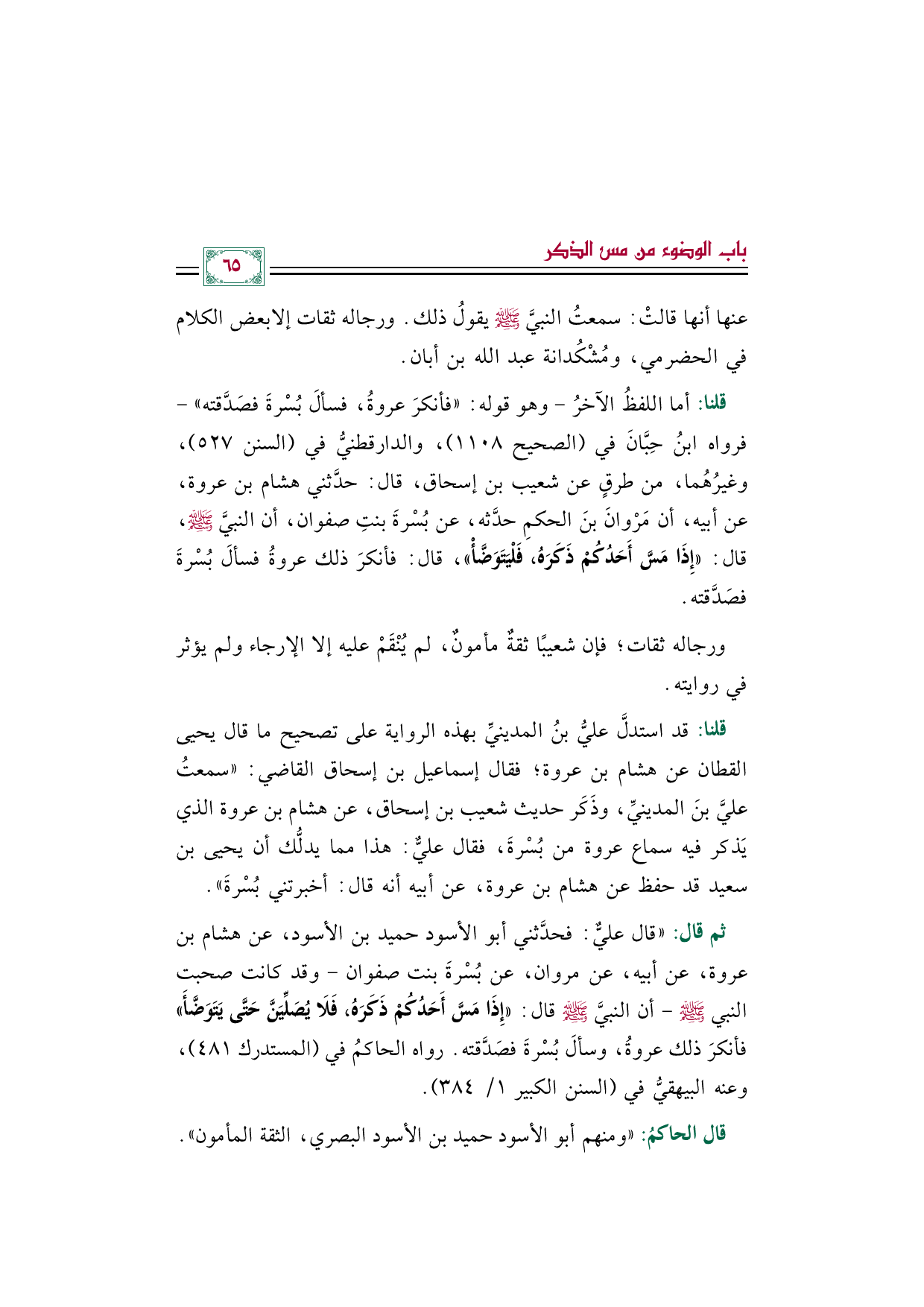 ثم قال: "قال عليٌّ: فحدَّثني أبو الأسود حميد بن الأسود، عن هشام بن عروة، عن أبيه، عن مروان، عن بُسْرةَ بنت صفوان -وقد كانت صحبت النبي صلى الله عليه وسلم- أن النبيَّ صلى الله عليه وسلم قال: ((إِذَا مَسَّ أَحَدُكُمْ ذَكَرَهُ، فَلَا يُصَلِّيَنَّ حَتَّى يَتَوَضَّأَ)) فأنكرَ ذلك عروةُ، وسألَ بُسْرةَ فصَدَّقته. رواه الحاكمُ في (المستدرك ٤٨١)، وعنه البيهقيُّ في (السنن الكبير ١/ ٣٨٤).