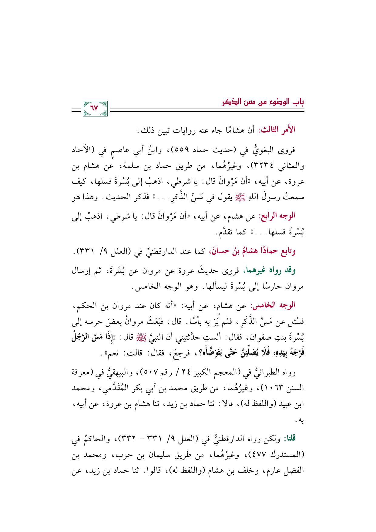الوجه الخامس: عن هشامٍ، عن أبيه: ((أنه كان عند مروان بن الحكم، فسُئل عن مَسِّ الذَّكَرِ، فلم يَرَ به بأسًا. قال: فبَعَثَ مروانُ بعضَ حرسه إلى بُسْرةَ بنتِ صفوان، فقال: ألستِ حدَّثتيني أن النبيَّ صلى الله عليه وسلم قال: ((إِذَا مَسَّ الرَّجُلُ فَرْجَهُ بِيَدِهِ، فَلَا يُصَلِّيَنَّ حَتَّى يَتَوَضَّأَ))؟ ، فرجعَ، فقال: قالت: نعم)).