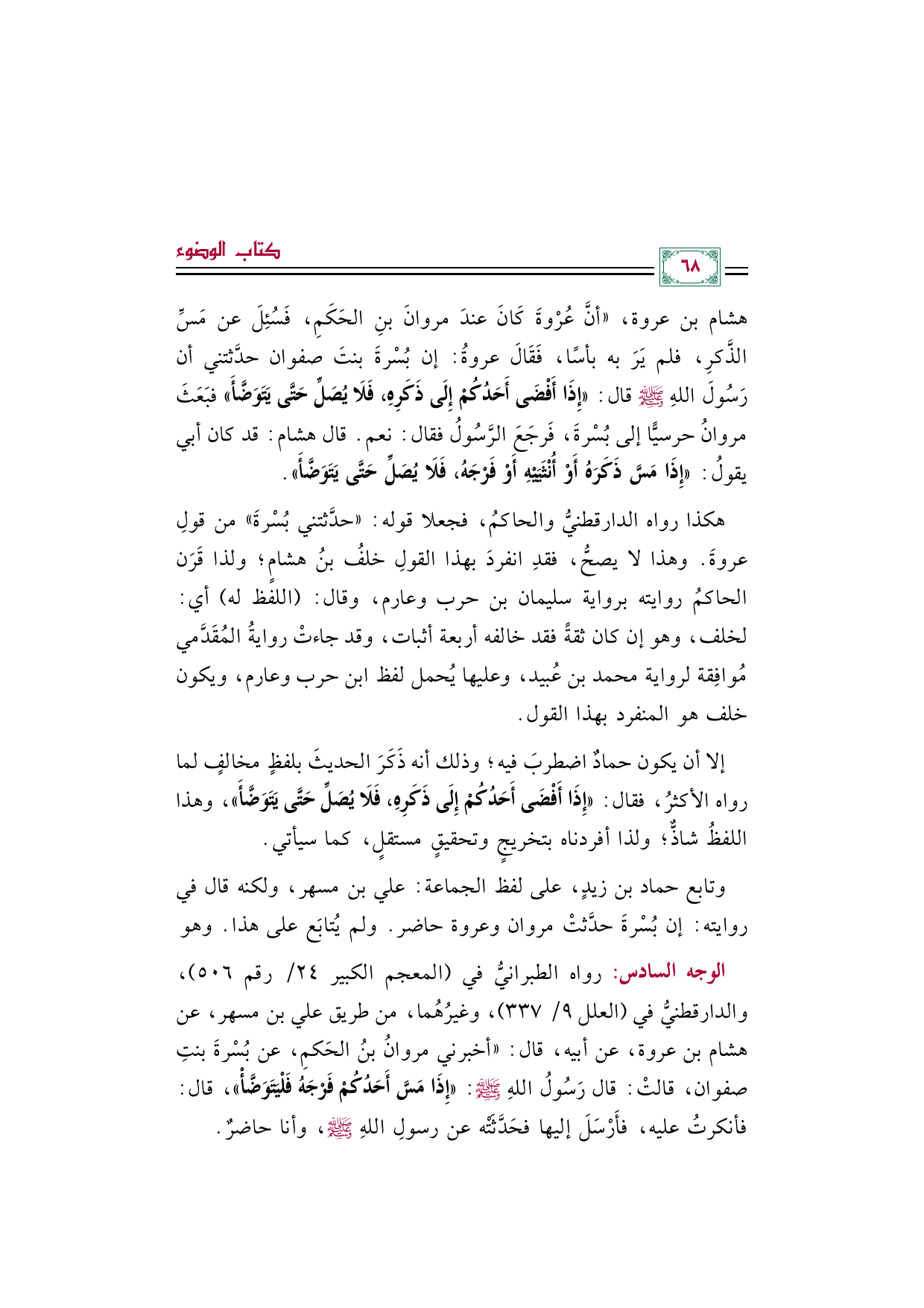 الوجه السادس: رواه الطبرانيُّ في (المعجم الكبير ٢٤/ رقم ٥٠٦)، والدارقطنيُّ في (العلل ٩/ ٣٣٧)، وغيرُهُما، من طريق علي بن مسهر، عن هشام بن عروة، عن أبيه، قال: ((أخبرني مروانُ بنُ الحَكمِ، عن بُسْرةَ بنتِ صفوان، قالتْ: قال رَسُولُ اللهِ صلى الله عليه وسلم: ((إِذَا مَسَّ أَحَدُكُمْ فَرْجَهُ فَلْيَتَوَضَّأْ))، قال: فأنكرتُ عليه، فأَرْسَلَ إليها فحَدَّثَتْه عن رسولِ اللهِ صلى الله عليه وسلم، وأنا حاضرٌ.
