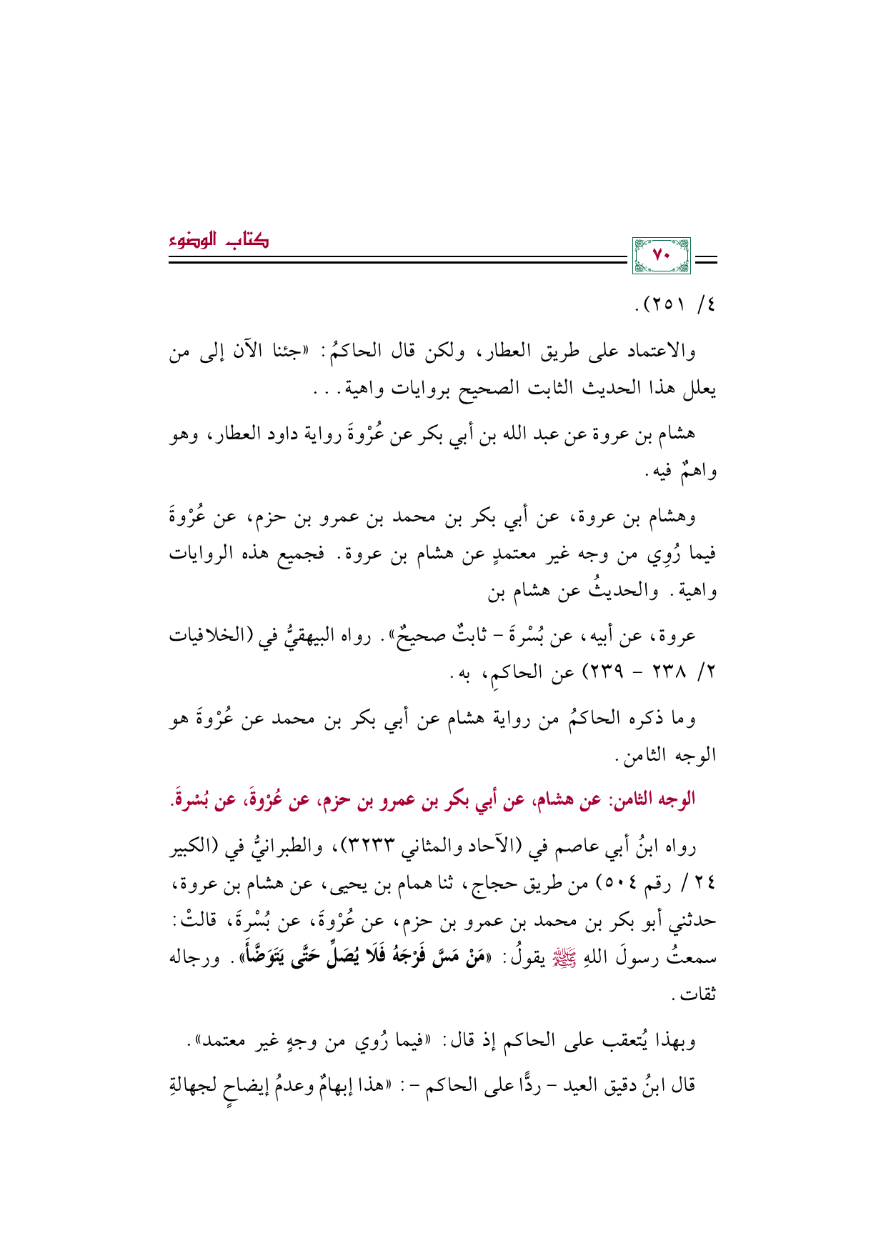 عروة، عن أبيه، عن بُسْرةَ- ثابتٌ صحيحٌ)). رواه البيهقيُّ في (الخلافيات ٢/ ٢٣٨ - ٢٣٩) عن الحاكمِ، به.