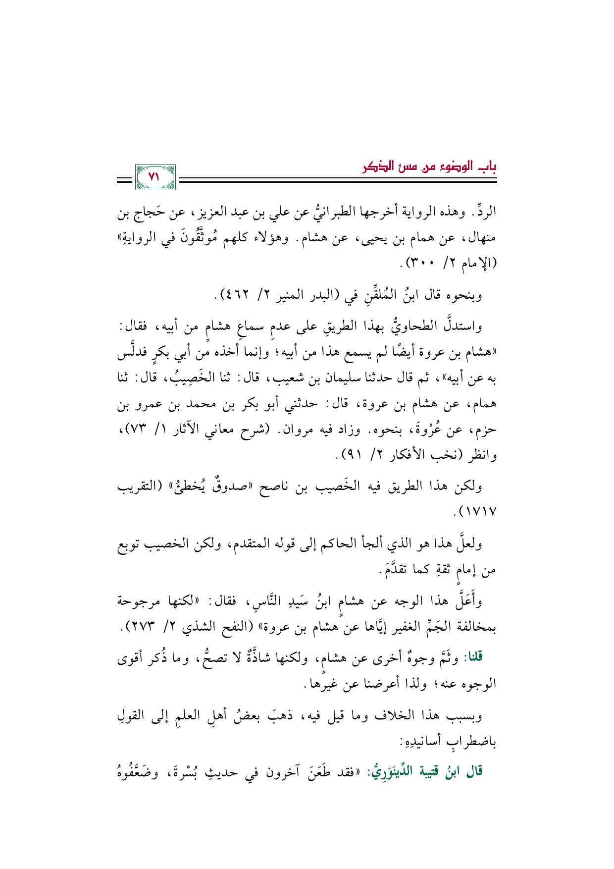 واستدلَّ الطحاويُّ بهذا الطريقِ على عدمِ سماعِ هشامٍ من أبيه، فقال: ((هشام بن عروة أيضًا لم يسمع هذا من أبيه؛ وإنما أخذه من أبي بكرٍ فدلَّس به عن أبيه))، ثم قال حدثنا سليمان بن شعيب، قال: ثنا الخَصِيبُ، قال: ثنا همام، عن هشام بن عروة، قال: حدثني أبو بكر بن محمد بن عمرو بن حزم، عن عُرْوةَ، بنحوه. وزاد فيه مروان. (شرح معاني الآثار ١/ ٧٣)، وانظر (نخب الأفكار ٢/ ٩١).