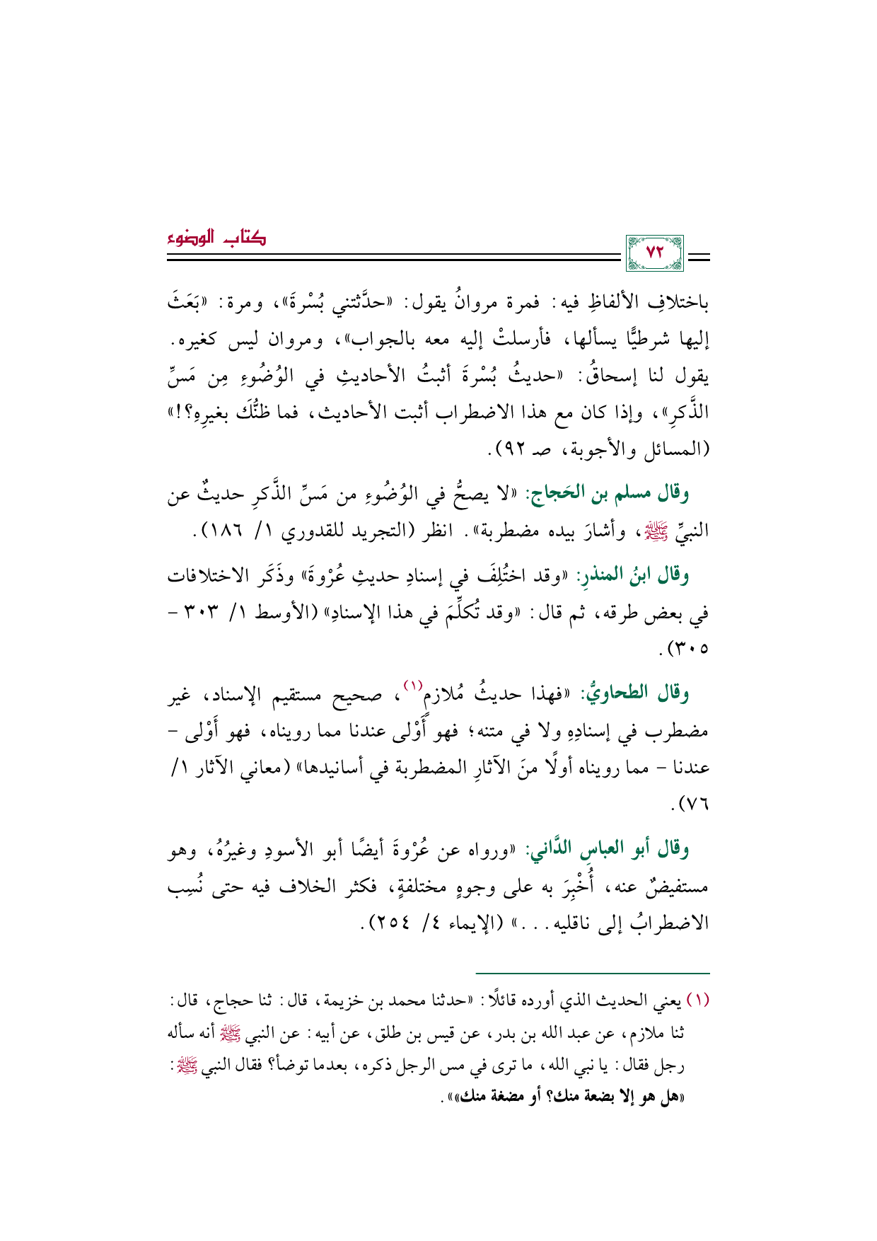باختلافِ الألفاظِ فيه: فمرة مروانُ يقول: ((حدَّثتني بُسْرةَ))، ومرة: ((بَعَثَ إليها شرطيًّا يسألها، فأرسلتْ إليه معه بالجواب))، ومروان ليس كغيره. يقول لنا إسحاقُ: ((حديثُ بُسْرةَ أثبتُ الأحاديثِ في الوُضُوءِ مِن مَسِّ الذَّكرِ))، وإذا كان مع هذا الاضطراب أثبت الأحاديث، فما ظنُّكَ بغيرِهِ؟ ! " (المسائل والأجوبة، صـ ٩٢).