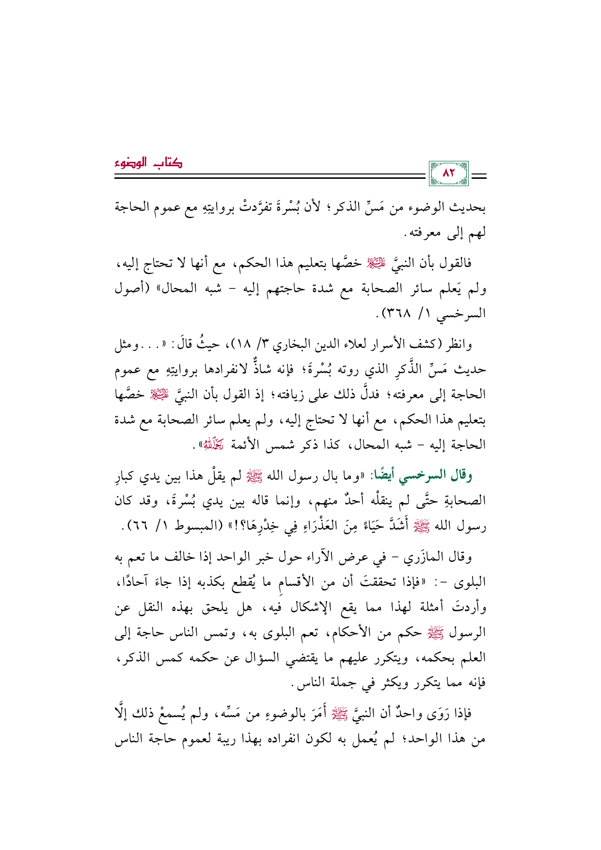 وانظر (كشف الأسرار لعلاء الدين البخاري ٣/ ١٨)، حيثُ قالَ: (( ... ومثل حديث مَسِّ الذَّكرِ الذي روته بُسْرةَ؛ فإنه شاذٌّ لانفرادها بروايتِهِ مع عموم الحاجة إلى معرفته؛ فدلَّ ذلك على زيافته؛ إذ القول بأن النبيَّ عليه السلام خصَّها بتعليم هذا الحكم، مع أنها لا تحتاج إليه، ولم يعلم سائر الصحابة مع شدة الحاجة إليه- شبه المحال، كذا ذكر شمس الأئمة رحمه الله)).