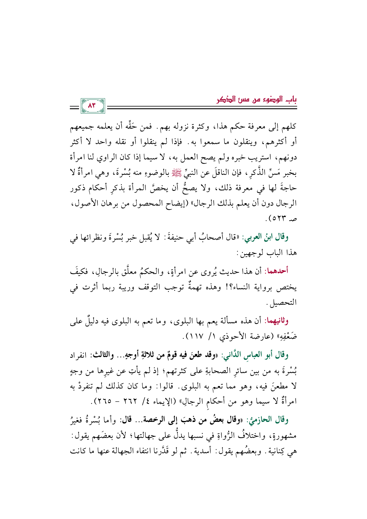 كلهم إلى معرفة حكم هذا، وكثرة نزوله بهم. فمن حَقِّه أن يعلمه جميعهم أو أكثرهم، وينقلون ما سمعوا به. فإذا لم ينقلوا أو نقله واحد لا أكثر دونهم، استريب خبره ولم يصح العمل به، لا سيما إذا كان الراوي لنا امرأة بخبر مَسِّ الذَّكرِ، فإن الناقلَ عن النبيِّ صلى الله عليه وسلم بالوضوءِ منه بُسْرةَ، وهي امرأةٌ لا حاجةَ لها في معرفة ذلك، ولا يصحُّ أن يخصَّ المرأة بذكرِ أحكام ذكور الرجال دون أن يعلم بذلك الرجال)) (إيضاح المحصول من برهان الأصول، صـ ٥٢٣).