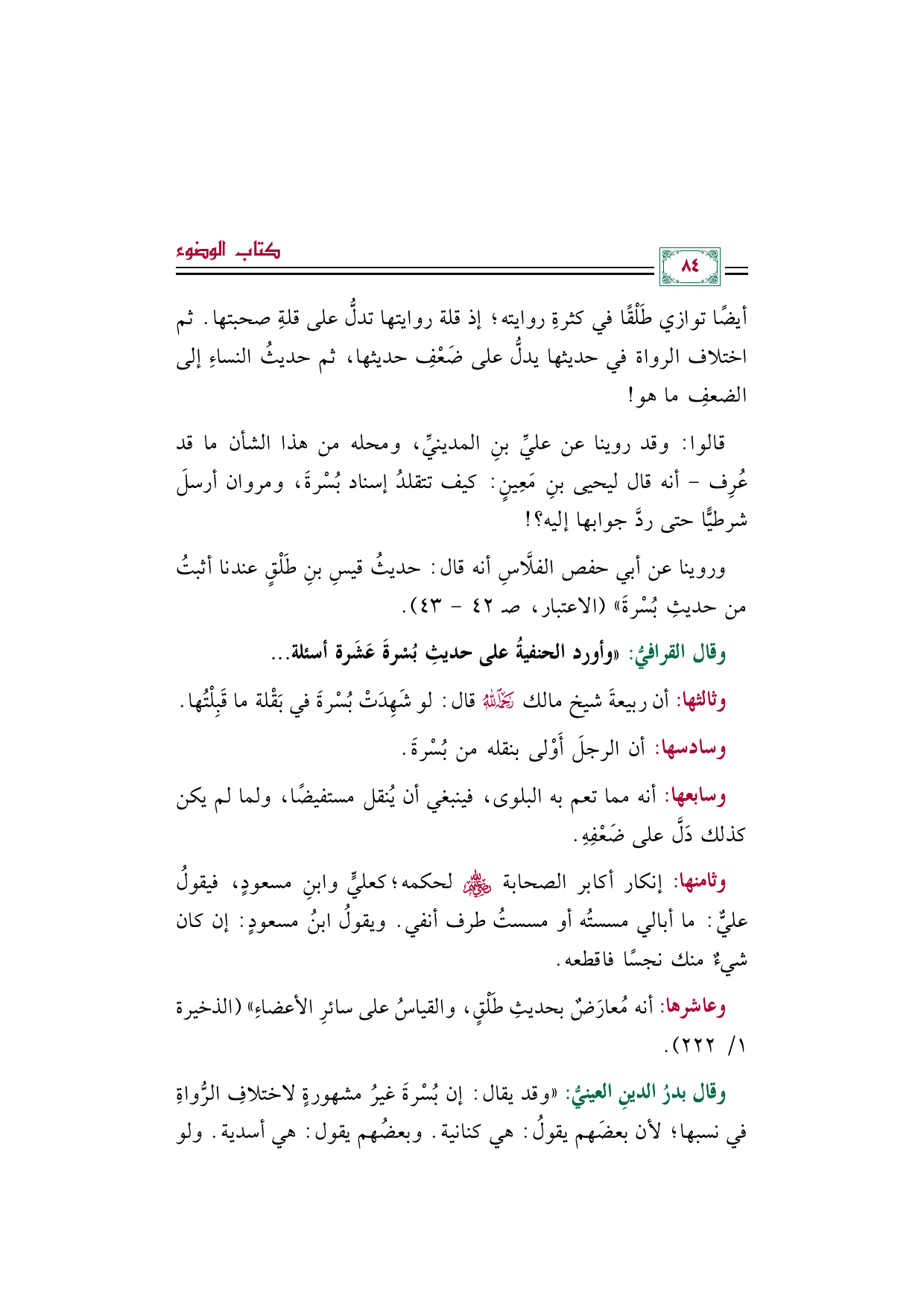 وقال القرافيُّ: ((وأورد الحنفيةُ على حديثِ بُسْرةَ عَشَرة أسئلة ...