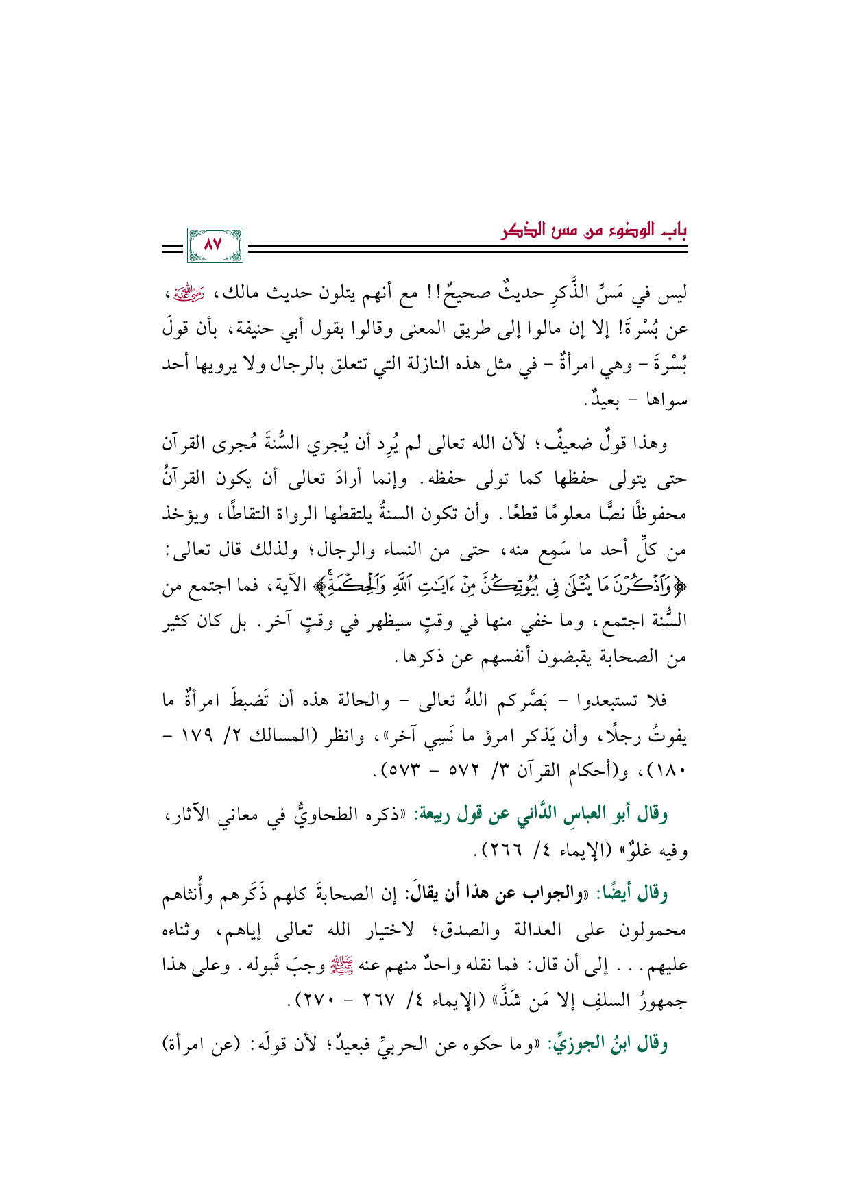 ليس في مَسِّ الذَّكرِ حديثٌ صحيحٌ! ! مع أنهم يتلون حديث مالك، رضي الله عنه، عن بُسْرةَ! إلا إن مالوا إلى طريق المعنى وقالوا بقول أبي حنيفة، بأن قولَ بُسْرةَ -وهي امرأةٌ- في مثل هذه النازلة التي تتعلق بالرجال ولا يرويها أحد سواها- بعيدٌ.
