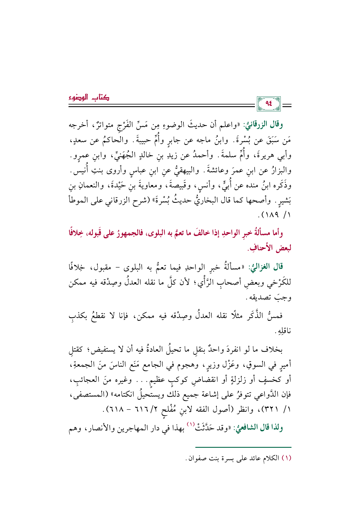 وقال الزرقانيُّ: ((واعلم أن حديثَ الوضوءِ مِن مَسِّ الفَرْجِ متواترٌ، أخرجه مَن سَبَقَ عن بُسْرةَ. وابنُ ماجه عن جابرٍ وأُمِّ حبيبةَ. والحاكمُ عن سعدٍ، وأبي هريرةَ، وأُمِّ سلمةَ. وأحمدُ عن زيدِ بنِ خالدٍ الجُهَنيِّ، وابنِ عمرٍو. والبزارُ عن ابنِ عمرَ وعائشةَ. والبيهقيُّ عنِ ابنِ عباسٍ وأروى بنتِ أُنيس. وذَكَره ابنُ منده عن أُبيٍّ، وأنسٍ، وقَبيصةَ، ومعاويةَ بنِ حَيْدةَ، والنعمانِ بنِ بَشيرٍ. وأصحها كما قال البخاريُّ حديثُ بُسْرةَ)) (شرح الزرقاني على الموطأ ١/ ١٨٩).