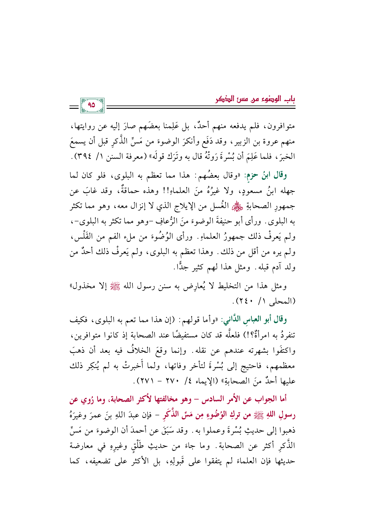 أما الجواب عن الأمر السادس -وهو مخالفتها لأكثر الصحابة، وما رُوي عن رسولِ اللهِ صلى الله عليه وسلم من تركِ الوُضُوءِ مِن مَسِّ الذَّكَرِ- فإن عبدَ اللهِ بنَ عمرَ وغيرَهُ ذهبوا إلى حديثِ بُسْرةَ وعملوا به. وقد سَبَقَ عن أحمدَ أن الوضوءَ من مَسِّ الذَّكرِ أكثر عن الصحابة. وما جاءَ من حديثِ طَلْقٍ وغيرِهِ في معارضة حديثها فإن العلماءَ لم يتفقوا على قَبولِهِ، بل الأكثر على تضعيفه، كما