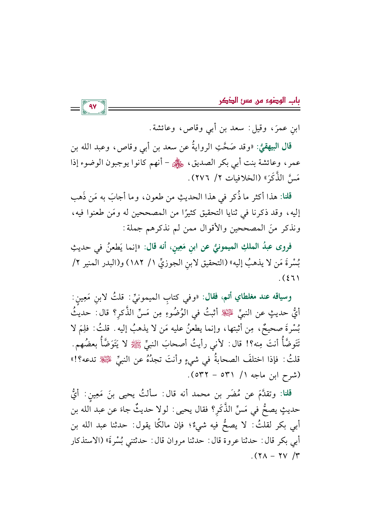 وسياقه عند مغلطاي أتم، فقال: ((وفي كتابِ الميمونيِّ: قلتُ لابنِ مَعِينٍ: أيُّ حديثٍ عن النبيِّ عليه السلام أثبتُ في الوُضُوءِ مِن مَسِّ الذَّكرِ؟ قال: حديثُ بُسْرةَ صحيحٌ، مِن أثبتها، وإنما يطعنُ عليه مَن لا يذهبُ إليه. قلتُ: فلِمَ لا تَتَوضَّأُ أنتَ مِنه؟ ! قال: لأني رأيتُ أصحابَ النبيِّ صلى الله عليه وسلم لا يَتَوَضَّأُ بعضُهم. قلتُ: فإذا اختلفَ الصحابةُ في شيءٍ وأنتَ تجدُهُ عن النبيِّ عليه السلام تدعه؟ ! )) (شرح ابن ماجه ١/ ٥٣١ - ٥٣٢).