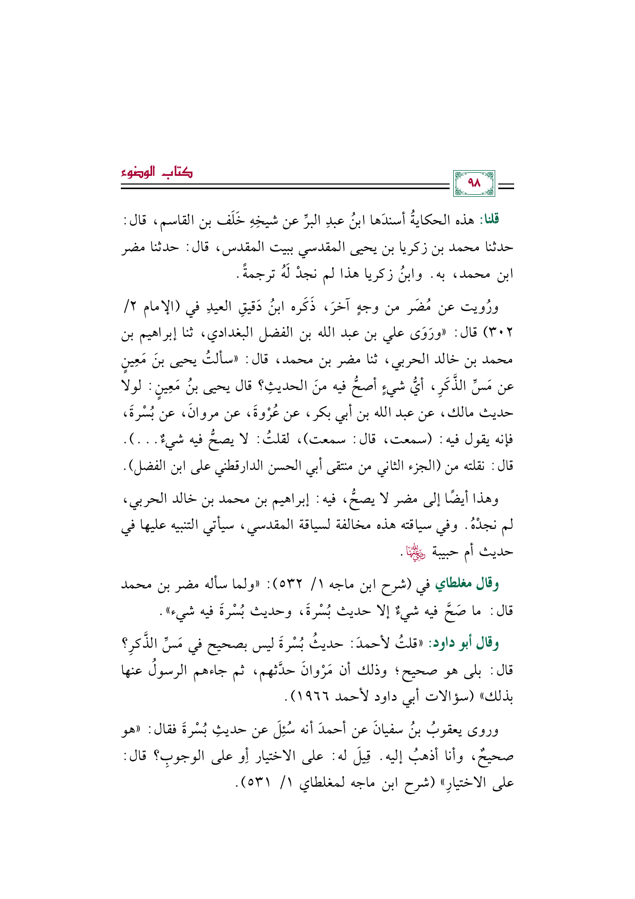 وقال مغلطاي في (شرح ابن ماجه ١/ ٥٣٢): ((ولما سأله مضر بن محمد قال: ما صَحَّ فيه شيءٌ إلا حديث بُسْرةَ، وحديث بُسْرةَ فيه شيء)).