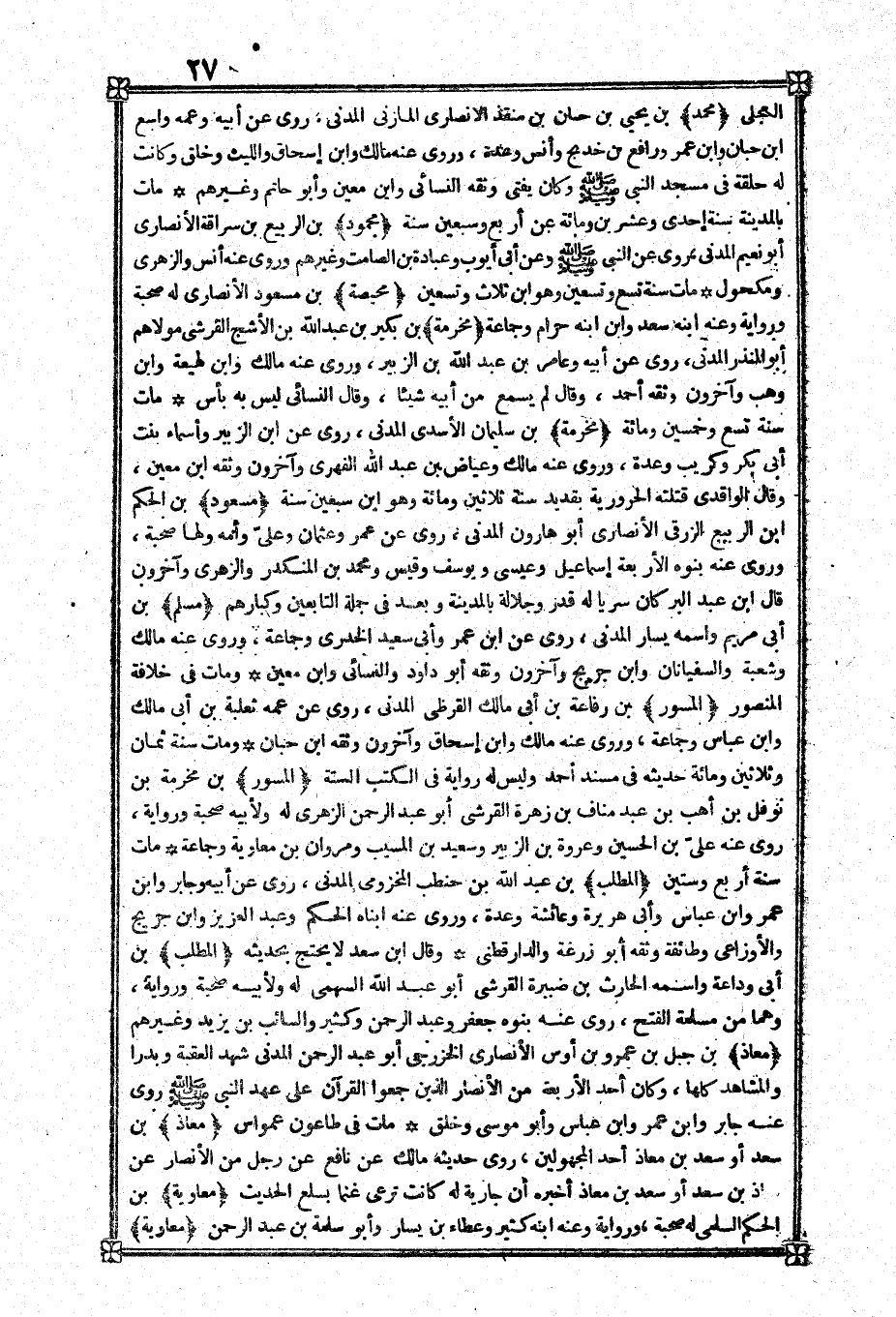 معَاذ بن جبل بن عَمْرو بن أَوْس الْأنْصَارِيّ الخزرجي أَبُو عبد الرَّحْمَن الْمدنِي شهد الْعقبَة وبدرا والمشاهد كلهَا وَكَانَ أحد الْأَرْبَعَة من الْأَنْصَار الَّذين جمعُوا الْقُرْآن على عهد النَّبِي صلى الله عَلَيْهِ وَسلم روى عَنهُ جَابر وَابْن عمر وَابْن عَبَّاس وَأَبُو مُوسَى وَخلق مَاتَ فِي طاعون عمواس