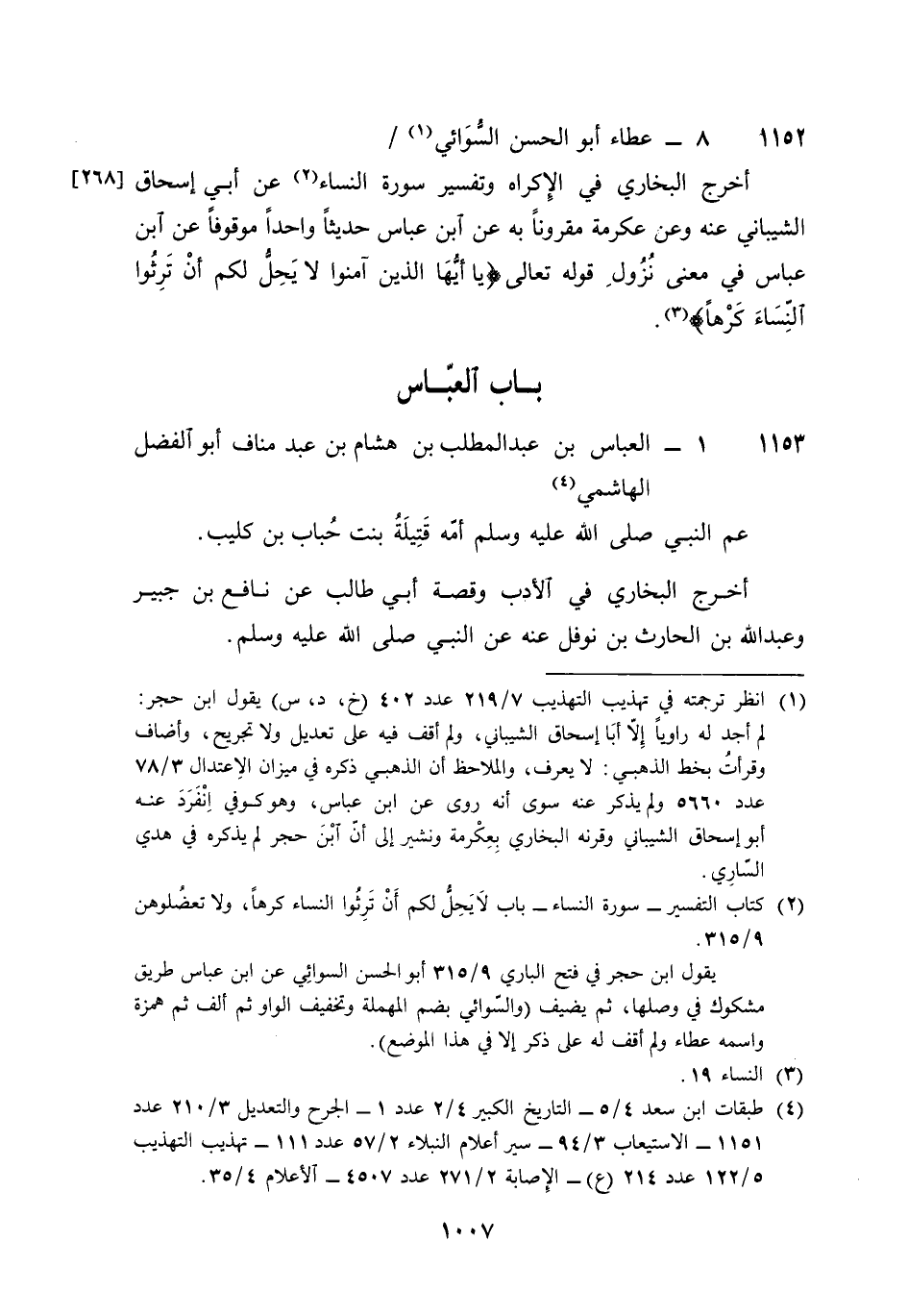 1153 - الْعَبَّاس بن عبد الْمطلب بن هِشَام بن عبد منَاف أَبُو الْفضل الْهَاشِمِي عَم النَّبِي صلى الله عَلَيْهِ وَسلم أمه قتيلة بنت حباب بن كُلَيْب أخرج البُخَارِيّ فِي الْأَدَب وقصة أبي طَالب عَن نَافِع بن جُبَير وَعبد الله بن الْحَارِث بن نَوْفَل عَنهُ عَن النَّبِي صلى الله عَلَيْهِ وَسلم قَالَ عَليّ بن الْمَدِينِيّ ولد قبل النَّبِي صلى الله عَلَيْهِ وَسلم وَمَات فِي سنة سِتّ من خلَافَة عُثْمَان أخرج البُخَارِيّ حَدثنَا عَليّ حَدثنَا جرير عَن مُغيرَة عَن أبي رزين قيل للْعَبَّاس أَنْت أكبر أَو رَسُول الله صلى الله عَلَيْهِ وَسلم فَقَالَ هُوَ أكبر مني وَولدت قبله وَأخرج فِيهِ حَدثنَا عَليّ حَدثنَا خَالِد بن الْحَارِث حَدثنَا شُعْبَة عَن عَمْرو بن مرّة سَمِعت ذكْوَان سَمِعت سهيلا مولى الْعَبَّاس يَقُول أَرْسلنِي الْعَبَّاس إِلَى عُثْمَان أَدْعُوهُ فَأَتَاهُ فَقَالَ أَفْلح الْوَجْه أَبَا الْفضل قَالَ ووجهك يَا أَمِير الْمُؤمنِينَ قَالَ عَليّ بن عمك وَابْن عَمَّتك وصهرك وأخوك فِي دينك وَصَاحِبك مَعَ رَسُول الله صلى الله عَلَيْهِ وَسلم وَبَلغنِي أَنَّك تُرِيدُ أَن تقوم بِهِ وبأصحابه فَقَالَ لَو شَاءَ عَليّ مَا كَانَ دونه أحد ثمَّ أَرْسلنِي إِلَى عَليّ فَقَالَ إِن عُثْمَان بن عمك وَابْن عَمَّتك وأخوك فِي دينك وَصَاحِبك مَعَ رَسُول الله صلى الله عَلَيْهِ وَسلم وَولي بيعتك فَقَالَ لَو أَمرتنِي أَن أخرج من دَاري لفَعَلت قَالَ عَمْرو بن عَليّ مَاتَ الْعَبَّاس بن عبد الْمطلب سنة اثْنَتَيْنِ وَثَلَاثِينَ فِي خلَافَة عُثْمَان وَهُوَ بن ثَمَان وَثَمَانِينَ سنة
