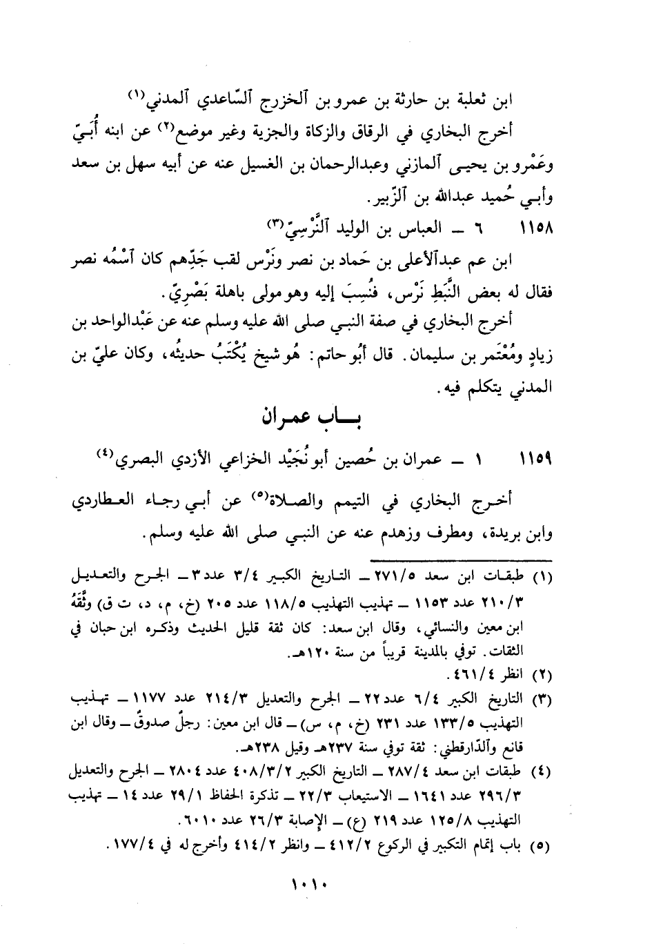 1159 - عمرَان بن حُصَيْن أَبُو نجيد الْخُزَاعِيّ الْأَزْدِيّ الْبَصْرِيّ أخرج البُخَارِيّ فِي التَّيَمُّم وَالصَّلَاة عَن أبي رَجَاء العطاردي وَابْن بُرَيْدَة ومطرف وزهدم عَنهُ عَن النَّبِي صلى الله عَلَيْهِ وَسلم قَالَ الْهَيْثَم بن عدي توفّي بِالْبَصْرَةِ قبل زِيَاد بِسنة وَتُوفِّي زِيَاد سنة ثَلَاث وَخمسين فلحصين وَالِد عمرَان صُحْبَة