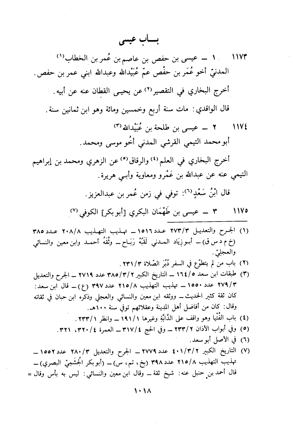 1173 - عِيسَى بن حَفْص بن عَاصِم بن عمر بن الْخطاب الْمدنِي أَخُو عمر بن حَفْص عَم عبيد الله وَعبد الله ابْني عمر بن حَفْص أخرج البُخَارِيّ فِي التَّقْصِير عَن يحيى الْقطَّان عَنهُ عَن أَبِيه قَالَ الْوَاقِدِيّ مَاتَ سنة أَربع وَخمسين وَمِائَة وَهُوَ بن ثَمَانِينَ سنة