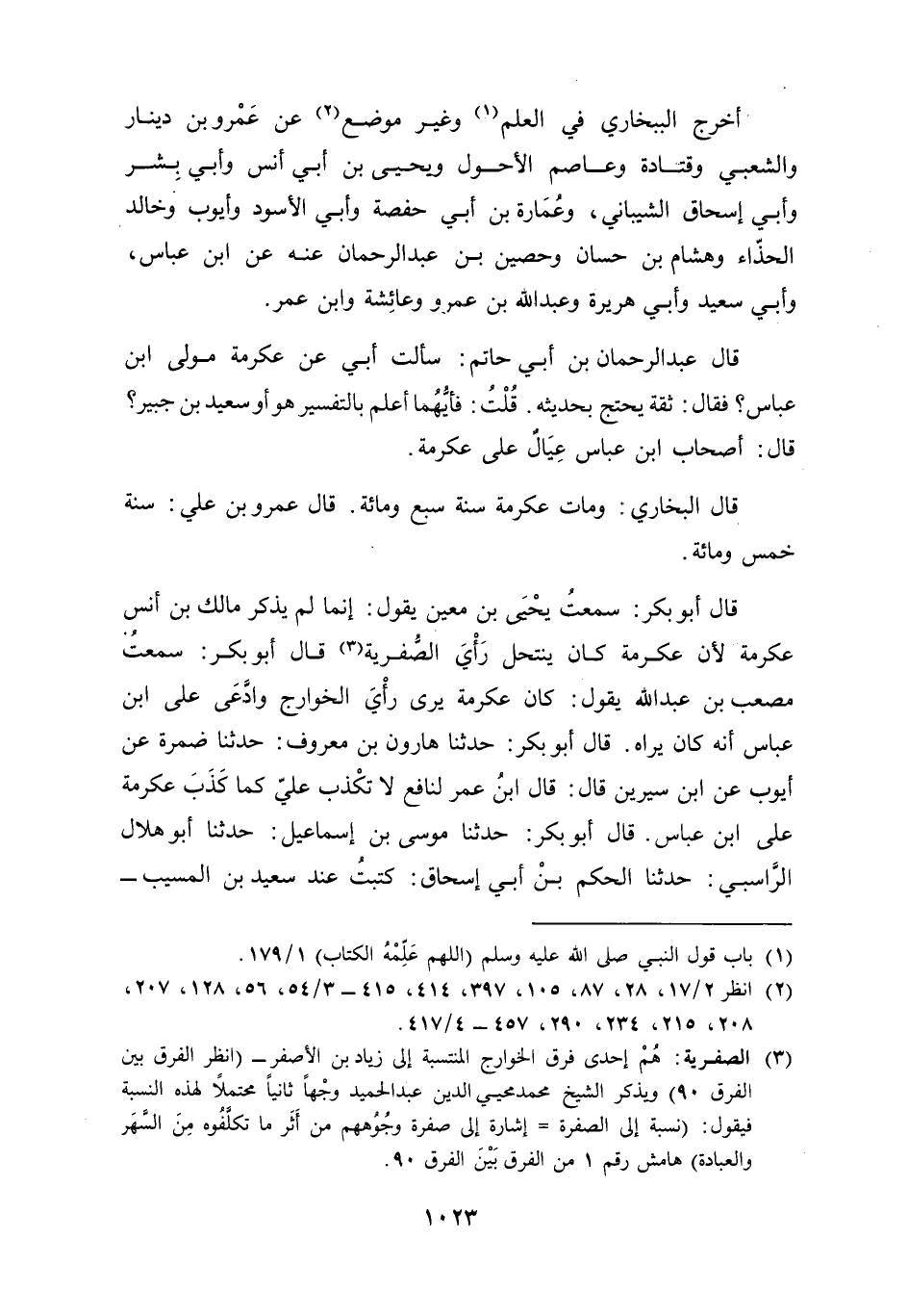 أخرج البُخَارِيّ فِي الْعلم وَغير مَوضِع عَن عَمْرو بن دِينَار وَالشعْبِيّ وَقَتَادَة وَعَاصِم الْأَحول وَيحيى بن أبي أنس وَأبي بشر وَأبي إِسْحَاق الشَّيْبَانِيّ وَعمارَة بن أبي حَفْصَة وَأبي الْأسود وَأَيوب وخَالِد الْحذاء وَهِشَام بن حسان وحصين بن عبد الرَّحْمَن عَنهُ عَن بن عَبَّاس وَأبي سعيد وَأبي هُرَيْرَة وَعبد الله بن عَمْرو وَعَائِشَة وَابْن عمر قَالَ عبد الرَّحْمَن بن أبي حَاتِم سَأَلت أبي عَن عِكْرِمَة مولى بن عَبَّاس فَقَالَ ثِقَة يحْتَج بحَديثه قلت فَأَيّهمَا أعلم بالتفسير هُوَ أَو سعيد بن جُبَير قَالَ أَصْحَاب بن عَبَّاس عِيَال على عِكْرِمَة قَالَ البُخَارِيّ وَمَات عِكْرِمَة سنة سبع وَمِائَة قَالَ عَمْرو بن عَليّ سنة خمس وَمِائَة قَالَ أَبُو بكر سَمِعت يحيى بن معِين يَقُول إِنَّمَا لم يذكر مَالك بن أنس عِكْرِمَة لِأَن عِكْرِمَة كَانَ ينتحل رَأْي الصفرية قَالَ أَبُو بكر سَمِعت مُصعب بن عبد الله يَقُول كَانَ عِكْرِمَة يرى رَأْي الْخَوَارِج وَادّعى على بن عَبَّاس أَنه كَانَ يرَاهُ قَالَ أَبُو بكر حَدثنَا هَارُون بن مَعْرُوف حَدثنَا ضَمرَة عَن أَيُّوب عَن بن سِيرِين قَالَ قَالَ بن عمر لنافع لَا تكذب عَليّ كَمَا كذب عِكْرِمَة على بن عَبَّاس قَالَ أَبُو بكر حَدثنَا مُوسَى بن إِسْمَاعِيل حَدثنَا أَبُو هِلَال الرَّاسِبِي حَدثنَا الحكم بن أبي إِسْحَاق كتبت عِنْد سعيد بن الْمسيب
