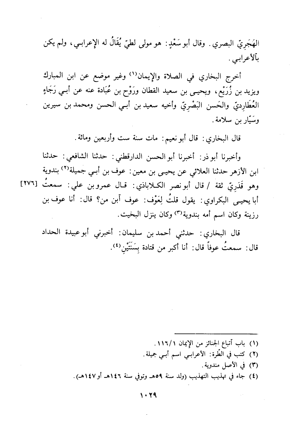 الهجري الْبَصْرِيّ وَقَالَ أَبُو سعد هُوَ مولى لطي يُقَال لَهُ الْأَعرَابِي وَلم يكن بالأعرابي أخرج البُخَارِيّ فِي الصَّلَاة وَالْإِيمَان وَغير مَوضِع عَن بن الْمُبَارك وَيزِيد بن زُرَيْع وَيحيى بن سعيد الْقطَّان وروح بن عبَادَة عَنهُ عَن أبي رَجَاء العطاردي وَالْحسن الْبَصْرِيّ وأخيه سعيد بن أبي الْحسن وَمُحَمّد بن سِيرِين وسيار بن سَلامَة قَالَ البُخَارِيّ قَالَ أَبُو نعيم مَاتَ سنة سِتّ وَأَرْبَعين وَمِائَة وَأخْبرنَا أَبُو ذَر أخبرنَا أَبُو الْحسن الدَّارَقُطْنِيّ حَدثنَا الشَّافِعِي حَدثنَا بن الْأَزْهَر حَدثنَا العلائي عَن يحيى بن معِين عَوْف بن أبي جميلَة بندوية وَهُوَ قدري ثِقَة قَالَ أَبُو نصر الكلاباذي قَالَ عَمْرو بن عَليّ سَمِعت أَبَا يحيى البكراوي يَقُول قلت لعوف عَوْف بن من قَالَ أَنا عَوْف بن رزينة وَكَانَ اسْم أمه بندوية وَكَانَ ينزل البخيت قَالَ البُخَارِيّ حَدثنِي أَحْمد بن سُلَيْمَان أَخْبرنِي أَبُو عُبَيْدَة الْحداد قَالَ سَمِعت عوفا قَالَ أَنا أكبر من قَتَادَة بِسنتَيْنِ
