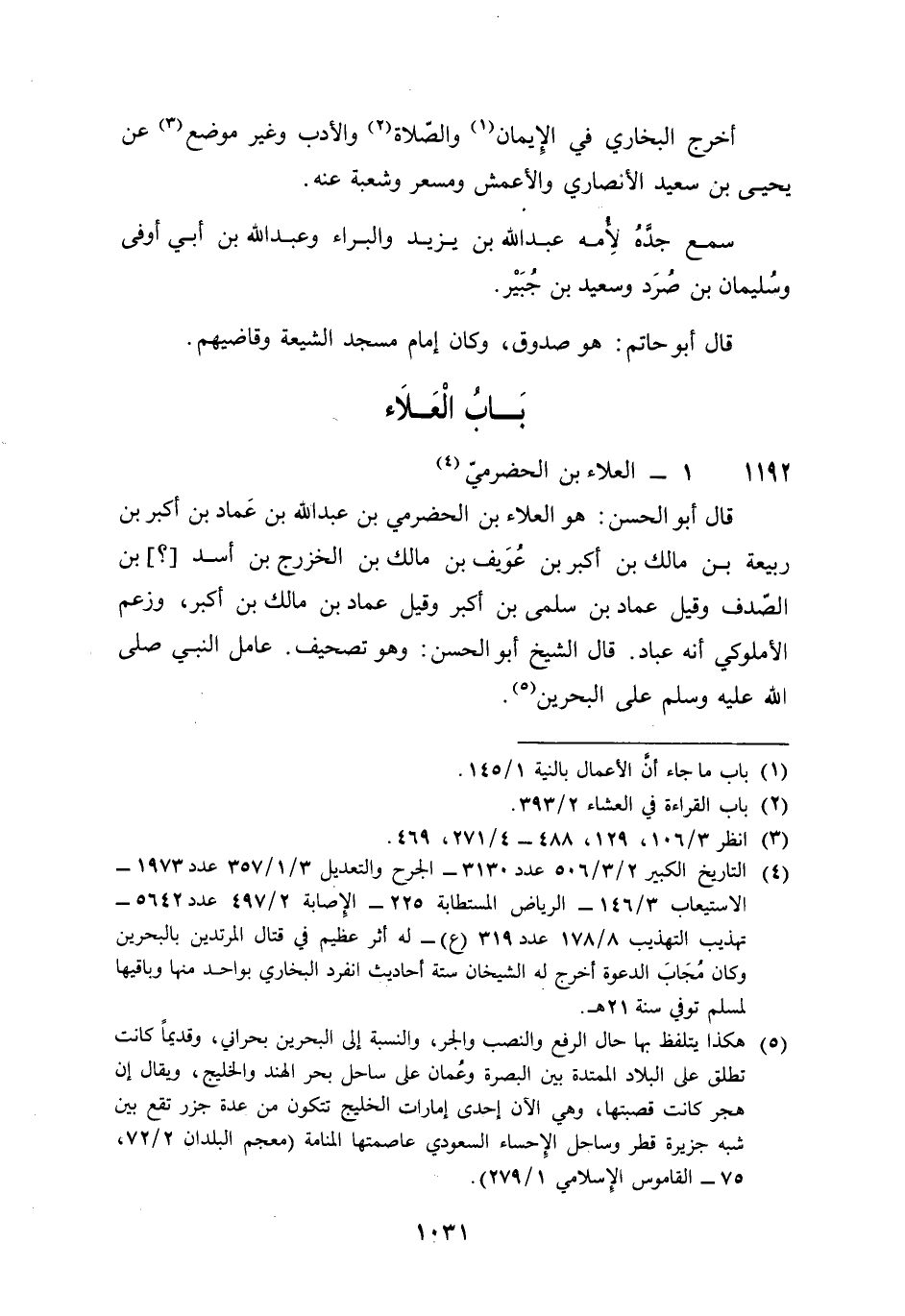 1192 - الْعَلَاء بن الْحَضْرَمِيّ قَالَ أَبُو الْحسن هُوَ الْعَلَاء بن الْحَضْرَمِيّ بن عبد الله بن عماد بن أكبر بن ربيعَة بن مَالك بن أكبر بن عويف بن مَالك بن الْخَزْرَج بن أَسد بن الصدف وَقيل عماد بن سلمى بن أكبر وَقيل عماد بن مَالك بن أكبر وَزعم الأملوكي أَنه عباد قَالَ الشَّيْخ أَبُو الْحسن وَهُوَ تَصْحِيف عَامل النَّبِي صلى الله عَلَيْهِ وَسلم على الْبَحْرين أخرج البُخَارِيّ فِي الْهِجْرَة عَن السَّائِب بن يزِيد عَنهُ عَن النَّبِي صلى الله عَلَيْهِ وَسلم