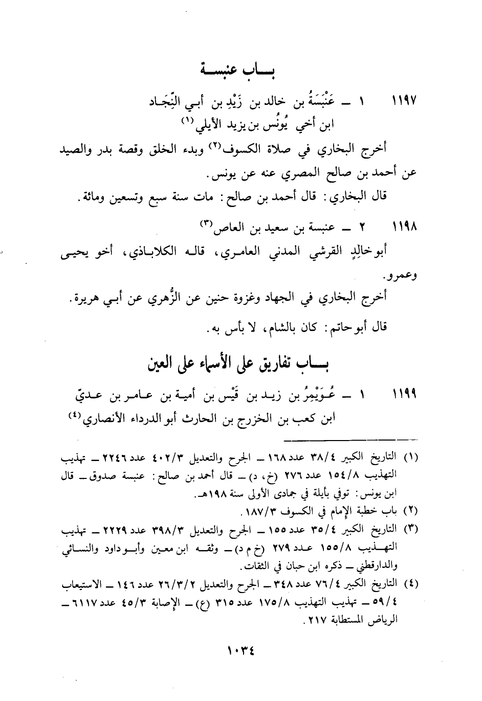 1197 - عَنْبَسَة بن خَالِد بن زيد بن أبي النجاد بن أخي يُونُس بن يزِيد الْأَيْلِي أخرج البُخَارِيّ فِي صَلَاة الْكُسُوف وبدء الْخلق وقصة بدر وَالصَّيْد عَن أَحْمد بن صَالح مَاتَ سنة سبع وَتِسْعين وَمِائَة