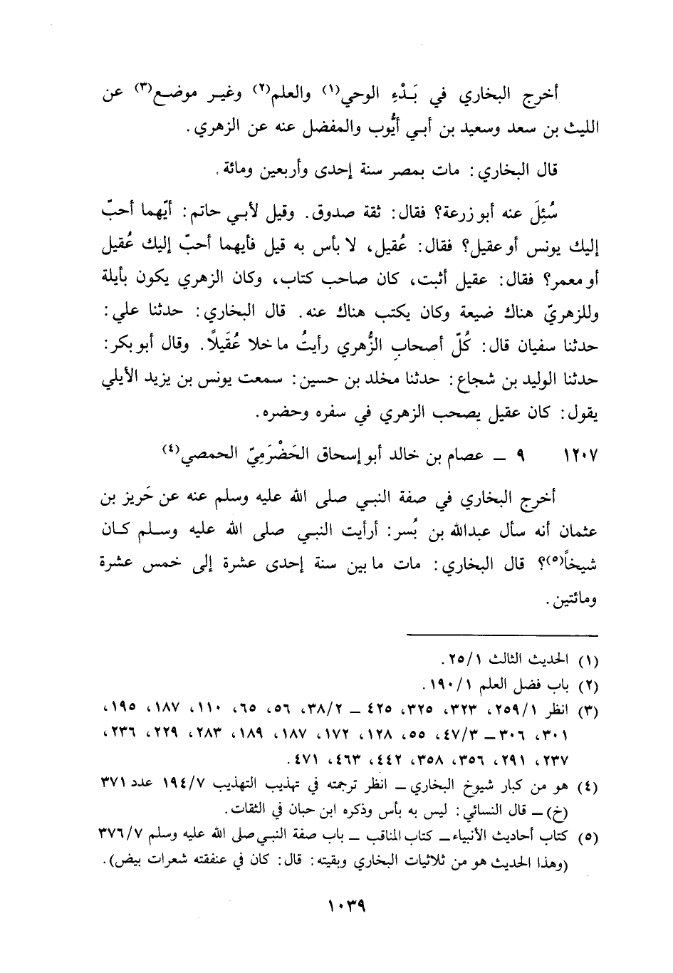 1207 - عِصَام بن خَالِد أَبُو إِسْحَاق الْحَضْرَمِيّ الْحِمصِي أخرج البُخَارِيّ فِي صفة النَّبِي صلى الله عَلَيْهِ وَسلم عَنهُ عَن حريز بن عُثْمَان أَنه سَأَلَ عبد الله بن سبر أَرَأَيْت النَّبِي صلى الله عَلَيْهِ وَسلم كَانَ شَيخا قَالَ البُخَارِيّ مَاتَ مَا بَين سنة إِحْدَى عشرَة إِلَى خمس عشرَة وَمِائَتَيْنِ