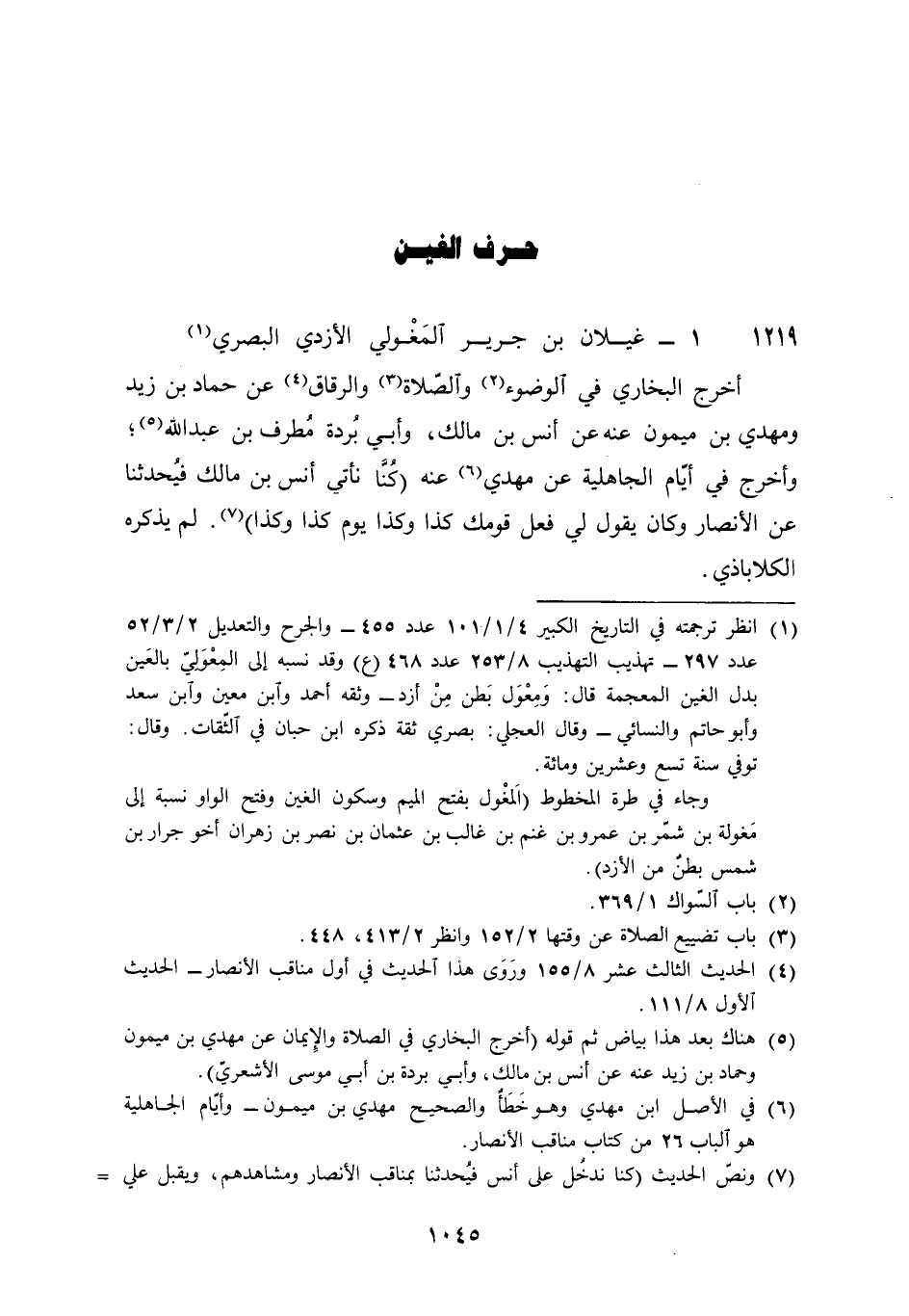 1219 - غيلَان بن جرير المغولي الْأَزْدِيّ الْبَصْرِيّ أخرج البُخَارِيّ فِي الْوضُوء وَالصَّلَاة والرقاق عَن حَمَّاد بن زيد ومهدي بن مَيْمُون عَنهُ عَن أنس بن مَالك وَأبي بردة مطرف بن عبد الله وَأخرج فِي أَيَّام الْجَاهِلِيَّة عَن مهْدي عَنهُ كُنَّا نأتي أنس بن مَالك فيحدثنا عَن الْأَنْصَار وَكَانَ يَقُول لي فعل قَوْمك كَذَا وَكَذَا يَوْم كَذَا وَكَذَا لم يذكرهُ الكلاباذي